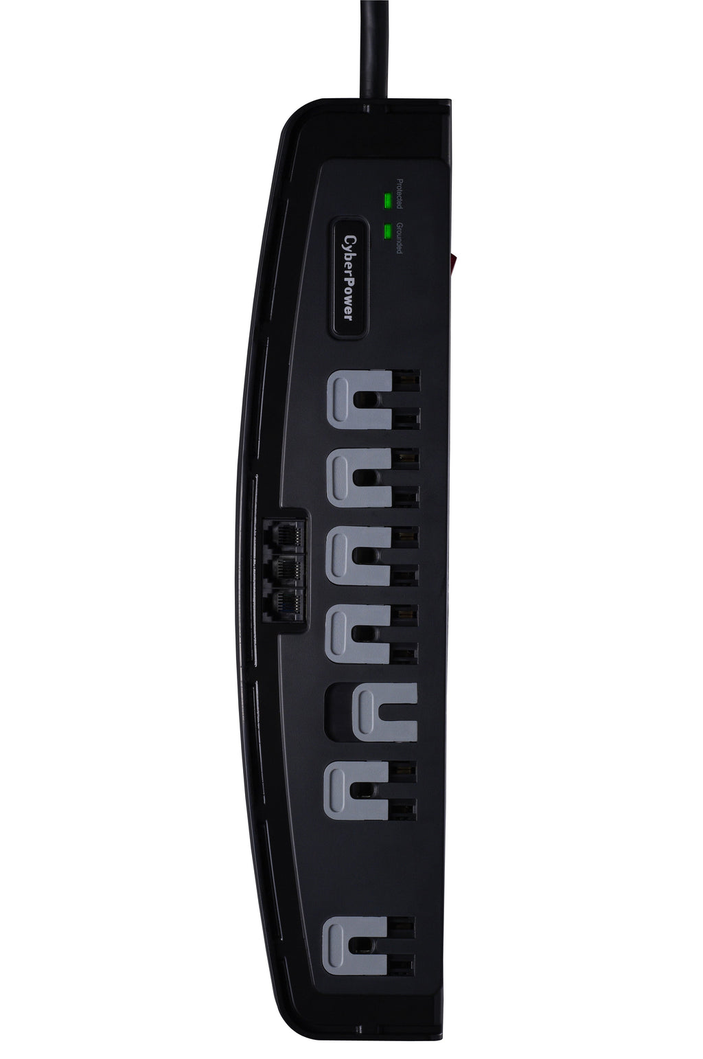 CyberPower CSP708T. Surge energy rating: 1650 J, AC outlets quantity: 7 AC outlet(s), AC outlet types: NEMA 5–15R. Product colour: Black, EMI/RFI noise filtering: 43 dB, Response time: 0.001 ms. Cable length: 2.4 m. Certification: UL1449 3, cUL. Input connections: NEMA 5-15P