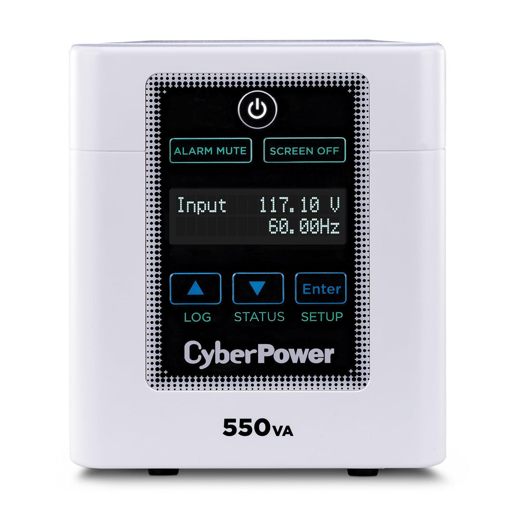 CyberPower M550L. UPS topology: Line-Interactive, Output power capacity: 0.55 kVA, Output power: 440 W. AC outlet types: NEMA 5-15R, Power plug: NEMA 5-15P-HG, AC outlets quantity: 4 AC outlet(s). Battery technology: Sealed Lead Acid (VRLA), Battery capacity: 7 Ah, Battery voltage: 12 V. Form factor: Mini Tower, Product colour: White, Cable length: 1.8 m. Width: 162 mm, Depth: 347 mm, Height: 137 mm