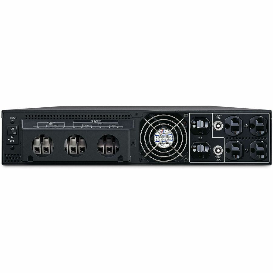 The OL10KSTF has a capacity of 10,000 VA / 10,000 Watts. It features six (6) NEMA 5-20R receptacles that can support output to NEMA 5-15P and 5-20P plug power cords. A hardwire output terminal block provides a means to connect to an electrical subpanel.
