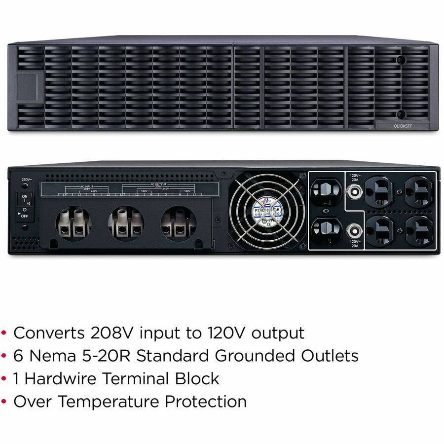 The CyberPower Smart App Online OL10KSTF rack/tower step-down isolation transformer converts 200 V to 240 V input voltage originating from utility power, a UPS, or a generator to 120 V output.