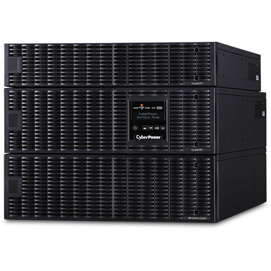 CyberPower OL6KRTF. UPS topology: Double-conversion (Online), Output power capacity: 6 kVA, Output power: 5400 W. AC outlet types: NEMA 5–20R,NEMA L6-20R,NEMA L6-30R, Power plug: NEMA L6-30P, AC outlets quantity: 10 AC outlet(s). Battery technology: Sealed Lead Acid (VRLA), Battery capacity: 7 Ah, Battery voltage: 12 V. Form factor: Rackmount/Tower, Product colour: Black, Housing material: Steel. Width: 433 mm, Depth: 660 mm, Height: 355.6 mm