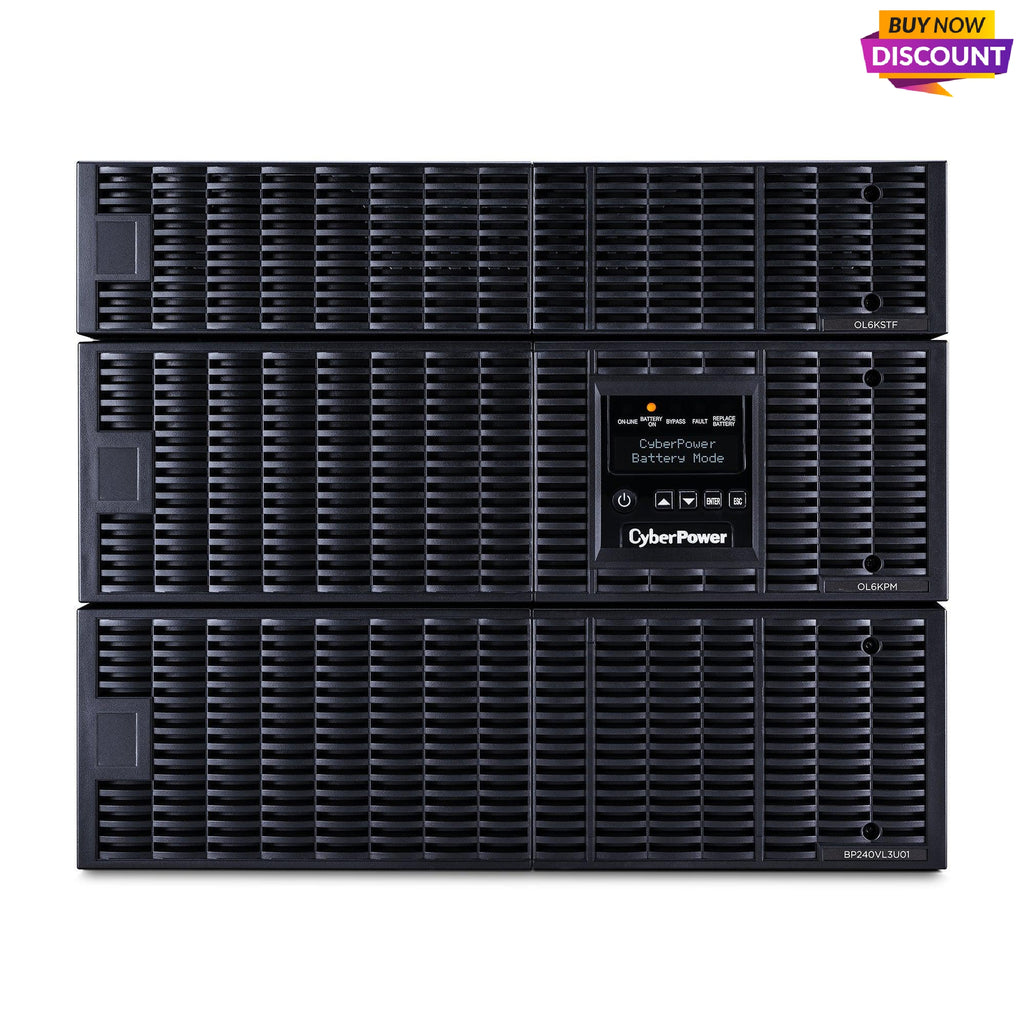 The CyberPower Smart App Online OL6KRTF is a combined 8U with a 6U rack/tower double-conversion UPS and a 2U step-down transformer to support 120 V and 200-240 V output requirements. It provides sine wave output to multiple types of critical IT infrastructure requiring seamless power protection. Generator-compatible, the OL6KRTF delivers consistent output power with zero transfer time. Automatic-bypass ensures connected equipment continues to operate seamlessly when an overload or internal fault is detected.