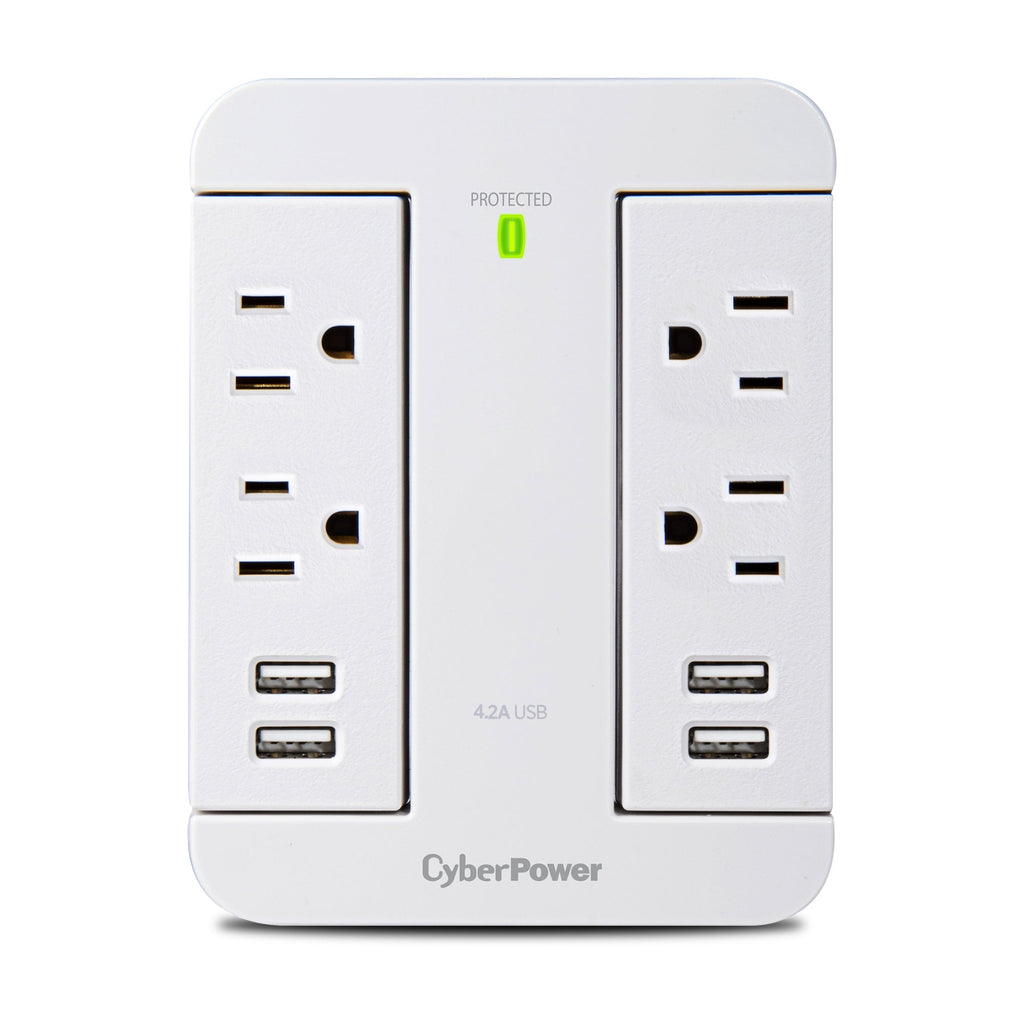 The CyberPower Home Office Surge Protector P4WSU expands a household outlet to safely and conveniently power several devices at a single location anywhere in the home. The wall tap design and swivel outlets make it easy to accommodate up to four power cords in tight plug-in locations. The four 4.2-Amp USB charging ports also swivel for efficient cord management.