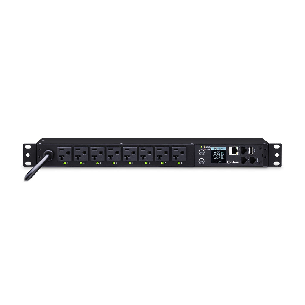CyberPower PDU41002. PDU types: Monitored, Switched, Rack capacity: 1U, Type: Single-phase. AC outlets quantity: 8 AC outlet(s), AC outlet types: NEMA 5–20R, Input connection type: NEMA 5-20P. Cable length: 3.7 m, Certification: UL, FCC. Firmware upgradeable via: Network, USB. Nominal input voltage: 100 - 120 V, Maximum current: 20 A, AC input frequency: 50 - 60 Hz