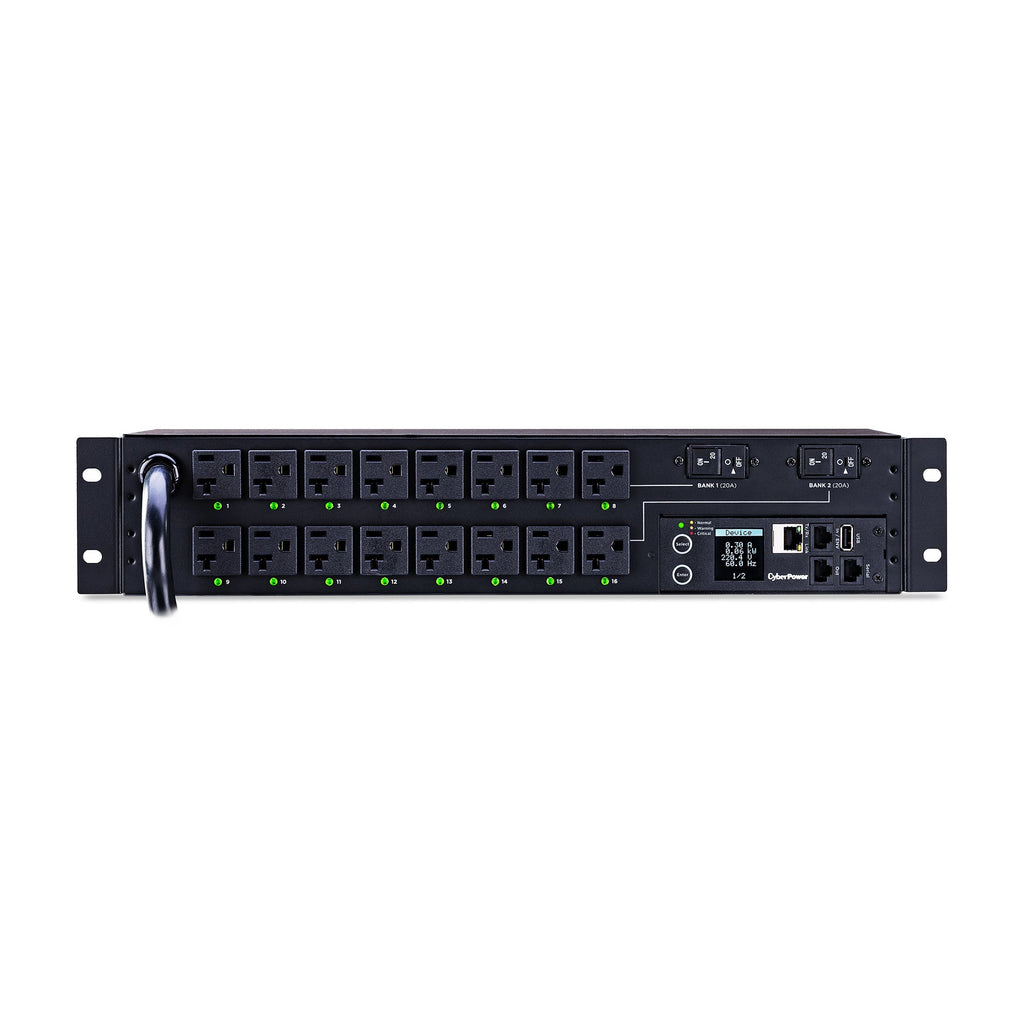 The CyberPower PDU41003, a 2U rackmount, monitored power distribution unit (PDU) provides 100-120Vac, 30A output via sixteen (16) NEMA 5-20R receptacles from a single NEMA L5-30P input power plug. The switched outlet receptacles can be managed individually or collectively over the network, using the CyberPower Management Console, a web browser, and the RJ45 Ethernet port for network connection, or locally from the Power Control Display.