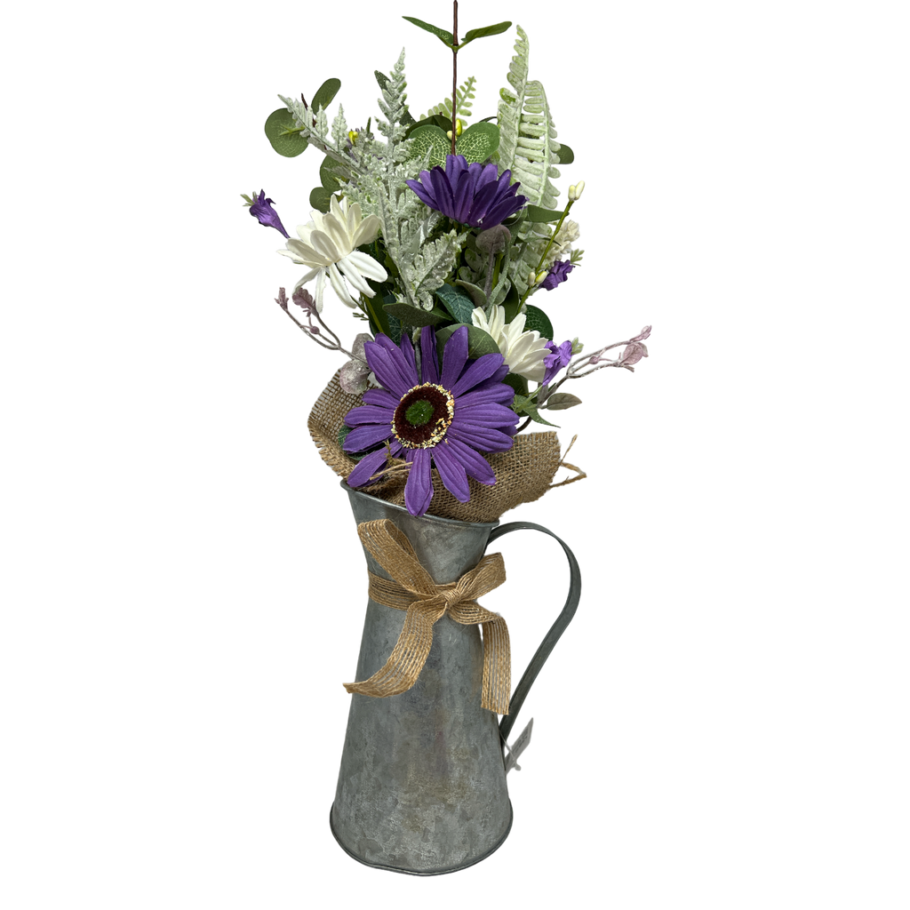 18-inch Artifical Ffloral Arrangement in galvanized metal pitcher with burlap bow is the ideal spring and summer home decor. The rustic vase and assorted flowers bring color and life to your decorations