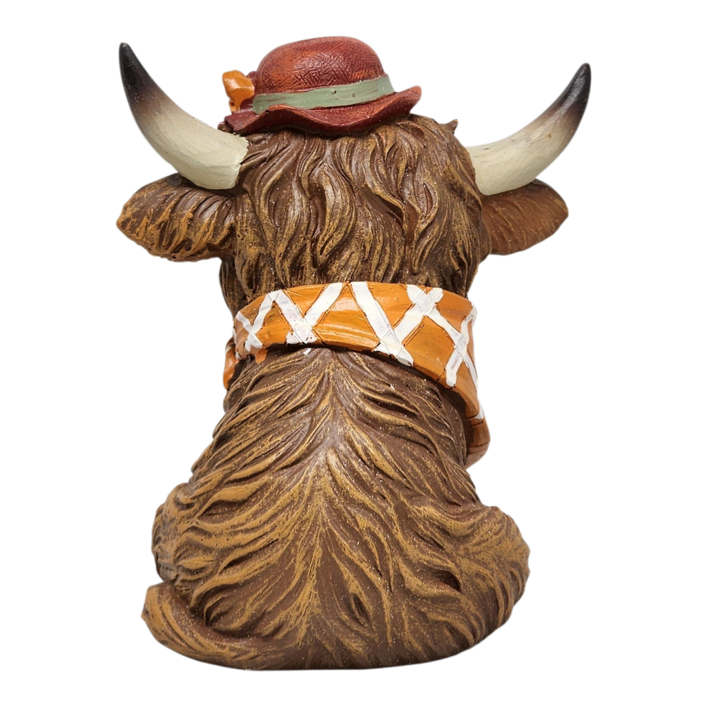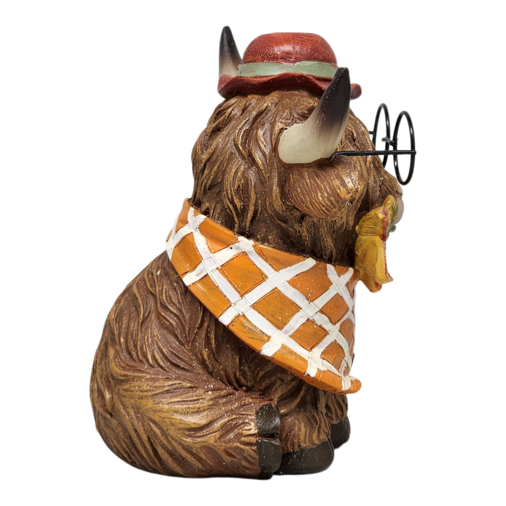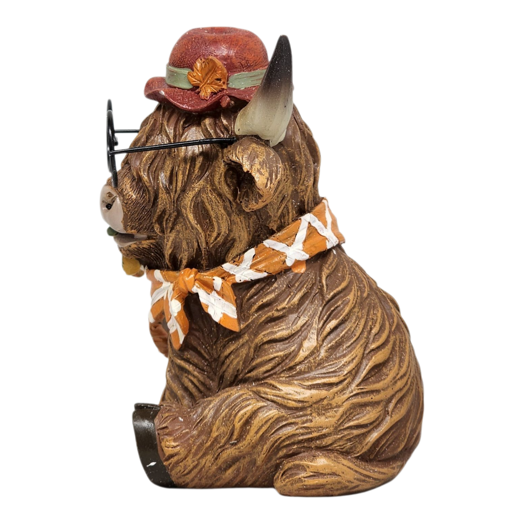 Meet the most fashionable bovine in town with our Dapper Harvest Highland Cow! Standing at around 5 inches tall, this delightful polyresin and stone powder figure showcases a spirited Highland Cow sporting a charming hat and round glasses. Draped in a stylish plaid scarf and nibbling on a leafy treat, this fashionable friend adds a whimsical touch to your autumn decor that is both adorable and humorous, perfect for any gathering this season.