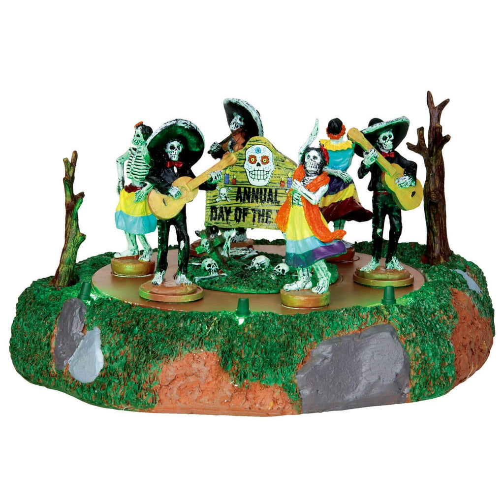 The backdrop is decorated with a wooden sign that reads "Annual Day of the Dead," depicting bright skulls and marigold flowers. The vibrant colors and intricate details bring an authentic touch to the scene. The base of the display is designed to look like a grassy hill adorned with stones and branches, with subtle green lights incorporated to add a mystical glow to the setting. Small skeletal figurines and bones are scattered around, adding to the spooky yet joyous atmosphere. Perfect for adding a splash of cultural festivity to your holiday village, this animated Day of the Dead scene is sure to be a conversation piece and a delight for all who witness it.