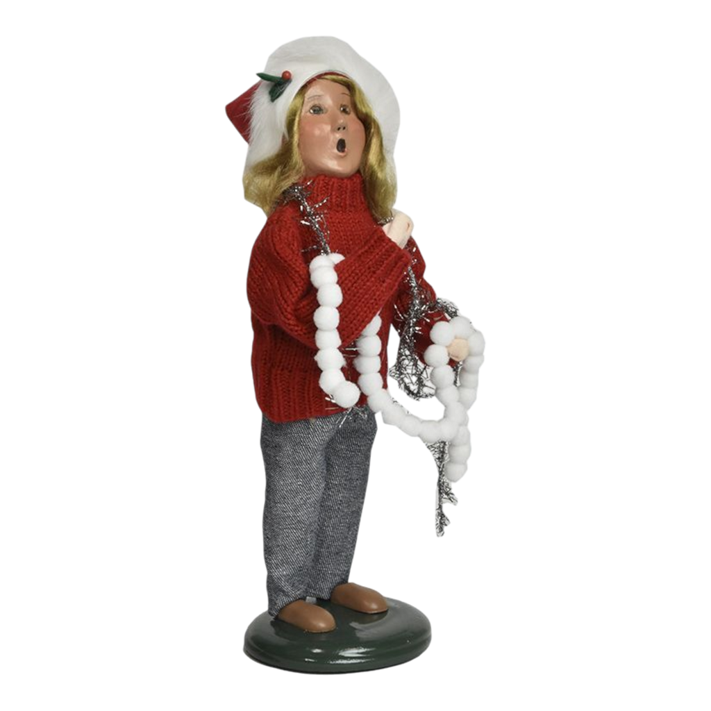 Embrace the enchanting spirit of the holiday season with the adorable Decorating Family Girl! This whimsical collectible figurine stands at 10 inches tall and captures the joy of festive preparations. Dressed in a cozy red sweater and festive hat, she holds a sparkling garland ready to adorn your Christmas tree. With her joyful expression and enthusiasm for decorating, this Byers' Choice creation brings warmth and charm to your holiday decor.