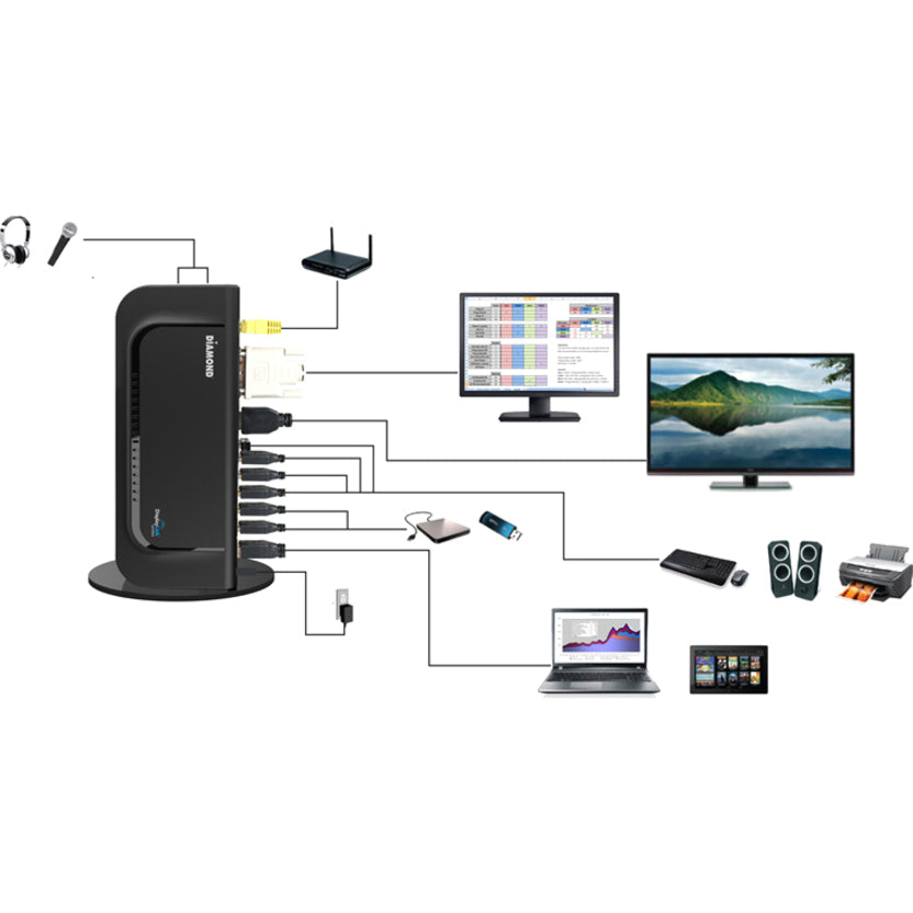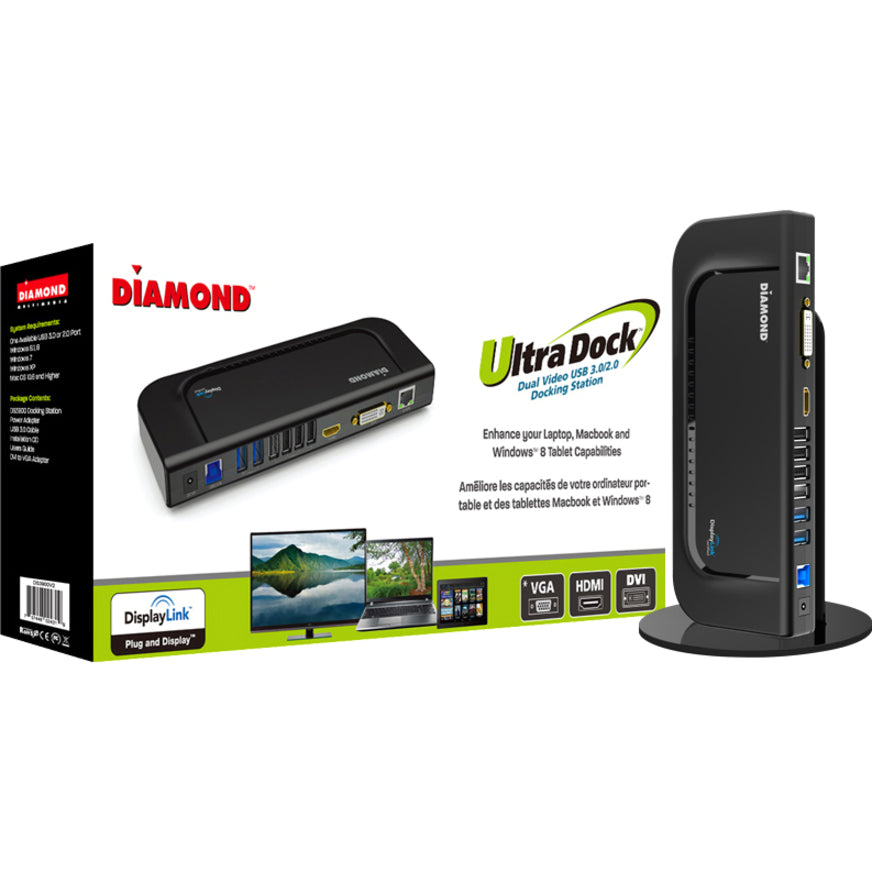 The Diamond DS3900V2 Ultra Dock docking station enables multiple USB devices to be connected to the laptop, notebook, Macbook, and Windows 8.1/8 tablets using a single USB 3.0/2.0. With one simple cable connection to your computer, you can have access to large screen displays, stereo speakers, external hard drives, optical disk drives, printers, USB keyboard, mouse, and other USB devices.