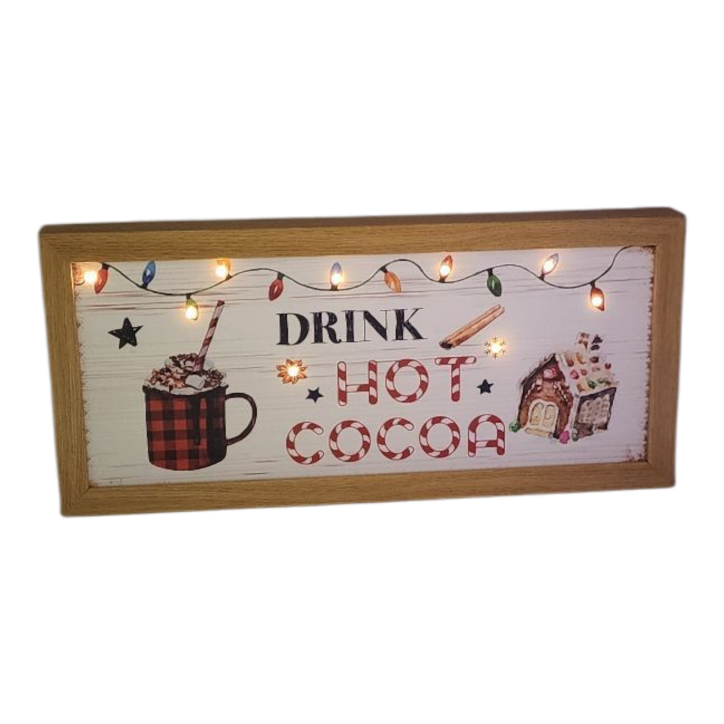 Perfect for holiday entertaining, this sign also makes a great gift for fellow cocoa enthusiasts or anyone who loves to create a warm, inviting atmosphere during the winter months. Whether displayed on a shelf, countertop, or wall, the Drink Hot Cocoa Lighted Sign is sure to spread joy and warmth throughout the holiday season and beyond!