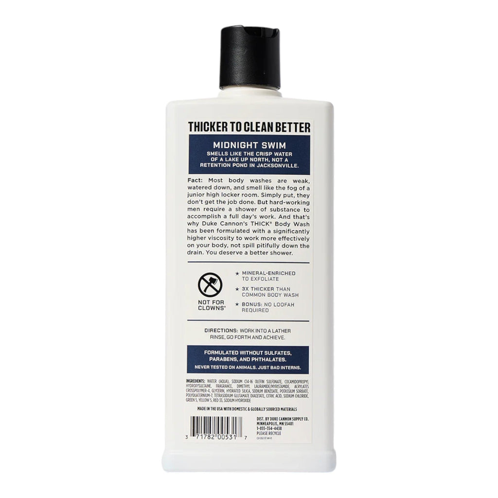 Browse the Complete Gifts & Holiday Collection Transform your shower experience with Duke Cannon's Thick Body Wash in the soothing Midnight Swim scent. This robust 18-ounce bottle is formulated to deliver a superior clean, designed for the modern man who appreciates luxury in his grooming routine. Infused with the calming aromas of sandalwood and lavender, this body wash captures the essence of a tranquil night spent by the water, creating an aromatic escape that lingers long after your shower.