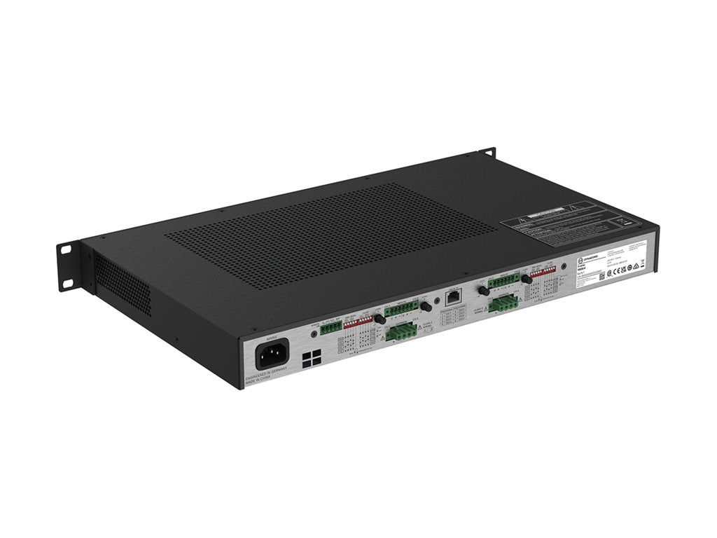 The Bosch Dynacord V600:4 amplifier is designed to meet the demanding needs of professional audio installations. With its robust 4-channel configuration, each channel delivering 600 W of power, this amplifier is capable of driving high-quality sound across various settings. The unit boasts a wide frequency response of 30 - 20,000 Hz and an exceptional signal-to-noise ratio of 103 dB, ensuring that your audio is both powerful and crystal clear.