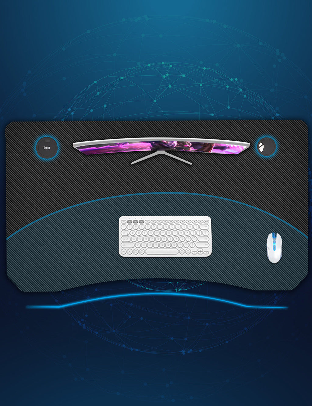 E-WIN Sound-Synced RGB LightingStep up your gaming ambiance with E-WIN's responsive RGB effects. As the sounds around you rise and fall, watch the lighting dynamically adapt in intensity and height. Just connect via USB and let your gaming sessions pulse with the rhythm of the action on the E-WIN gaming desk.E-WIN 2.0 Carbon Fiber Strength Gaming DesktopDive into expansive gaming on a surface spanning up to 48 inches in width, crafted from high-strength carbon fiber. Every inch is meticulously detailed with thousands of micro-level, light-reflective points, ensuring unparalleled tracking precision for next-gen gaming mice.Dual-Mode Wireless & USB ChargerElevate your E-WIN Gaming Desktop experience with our versatile 2-in-1 charger. Whether you prefer plugging in with USB or going completely wireless, we've got you covered. Charge up and game on, the choice is yours.E-WIN RGB Gaming Desk - Take Gaming to the Next LevelWe've Assembled The Ultimate Gaming Desk Configuration Available To Provide A Superior Gaming Experience. It's Time To Level Up.High-strength Aluminum Material Framed Legs for Maximum StabilityE-WIN RGB gaming desk is made of high-strength aluminum frame leg for maximum stability, and this ensures that your gaming rig is kept safely above the ground, away from dust and dirt.5° ERGONOMIC INCLINEGame longer with our ergonomic incline keyboard and mouse area. Having a ergonomic gaming desk is crucial for gaming for long periods of time. This gaming deskwas design to improve arm and wrist alignment, which reduces injury from using a keyboard and mouse for hours on end. Includes a large gaming mouse pad.