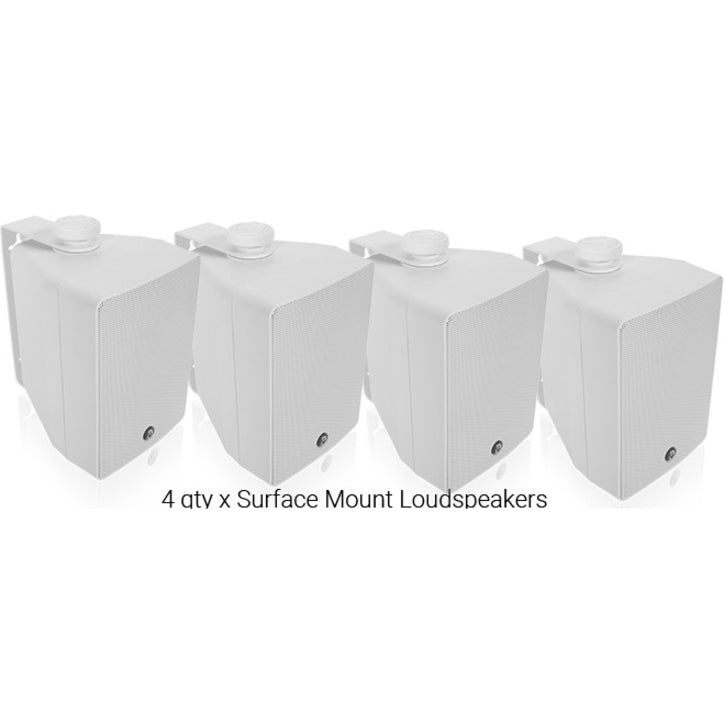 The EZSYS-BGM-S package is an entire business music and paging system. It is designed for surface-mount installations and includes the proper amplification, system control, and loudspeakers. All you need are audio sources and cables. The box illustrates the proper way to connect the equipment including cable and tool requirements