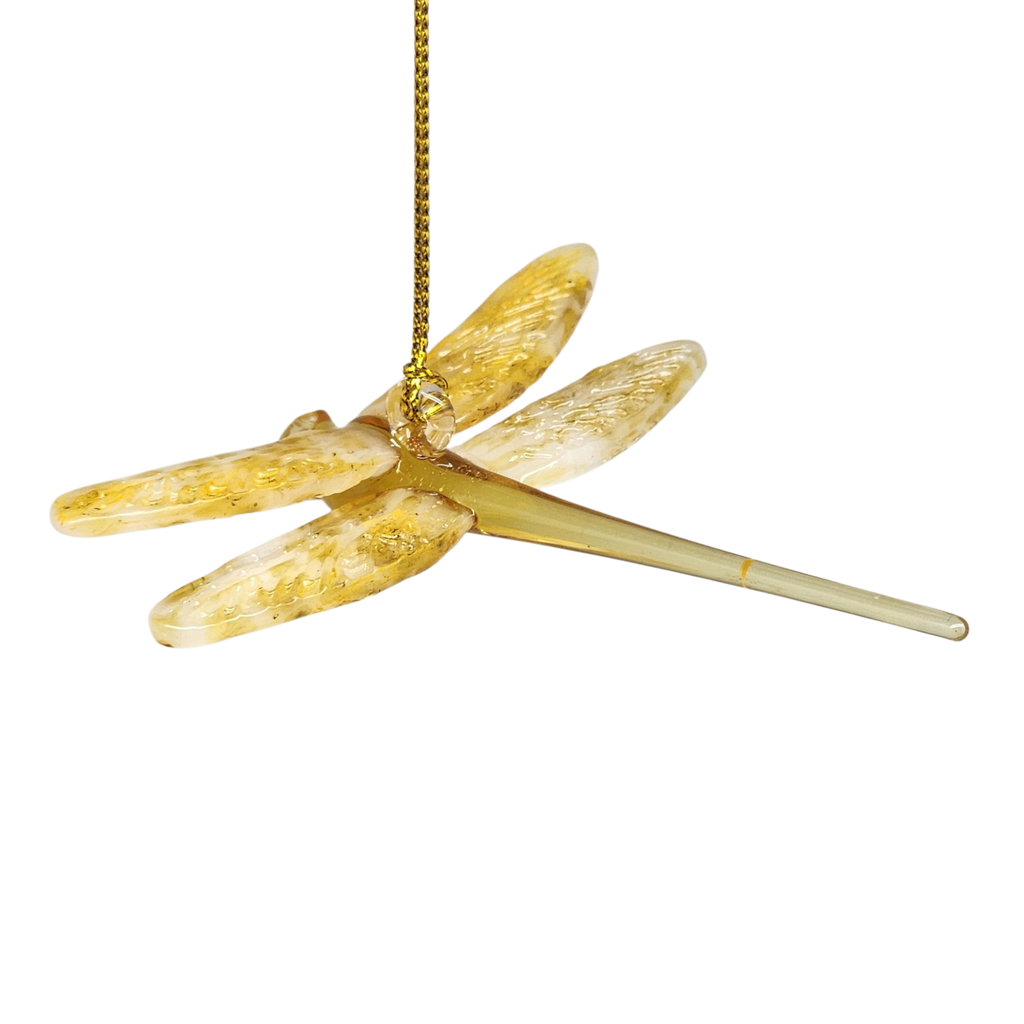 Celebrate the beauty of nature’s golden hour with this graceful mouthblown glass dragonfly ornament. Handmade in Egypt from German Pyrex glass, this piece captures the warm glow of sunlight with its translucent amber tones and delicately textured wings. The subtle golden hues evoke a sense of peace and warmth, perfect for adding a natural, luminous touch to your holiday decorations or everyday décor. The elongated body and finely detailed wings give the ornament a lifelike elegance that draws the eye and brightens any space.