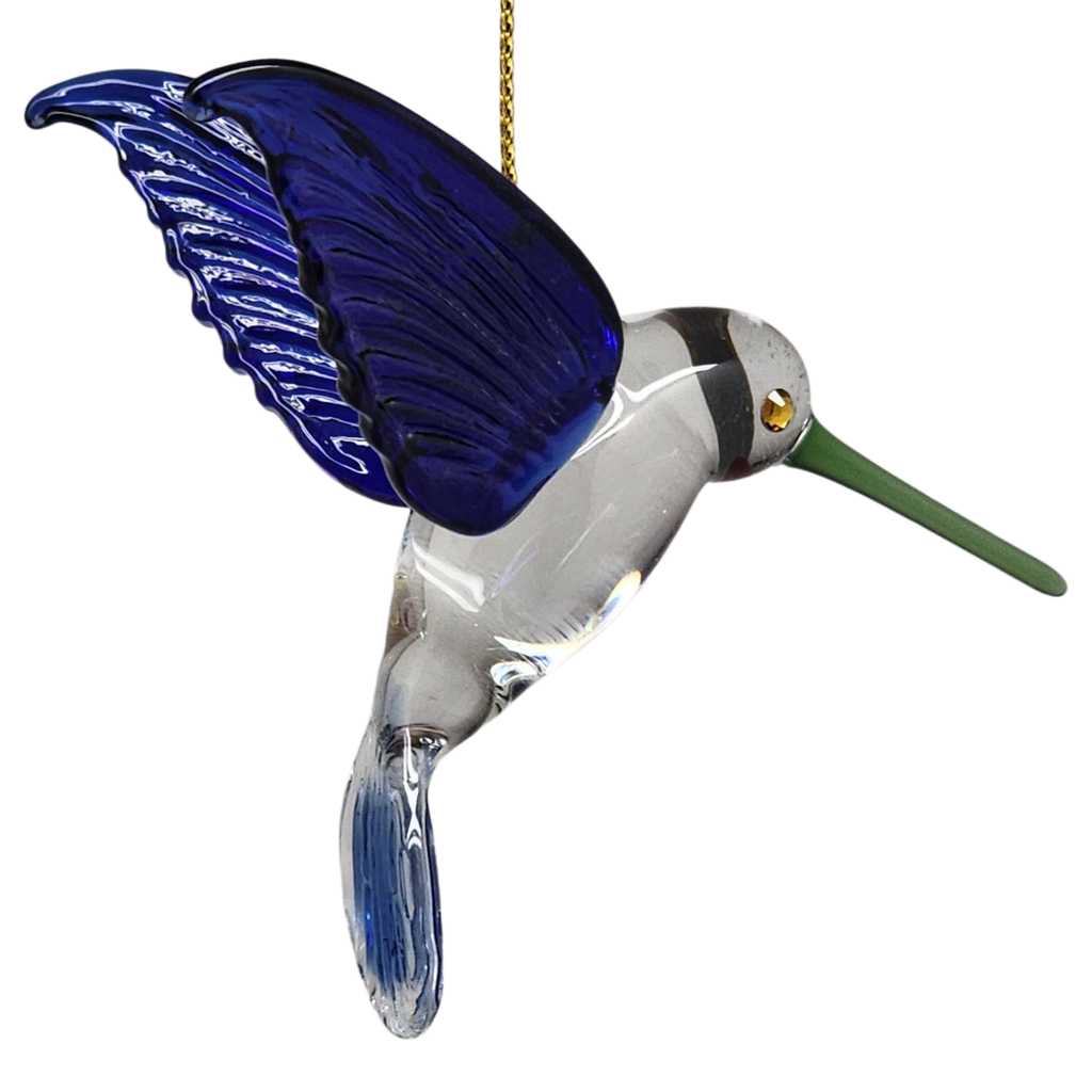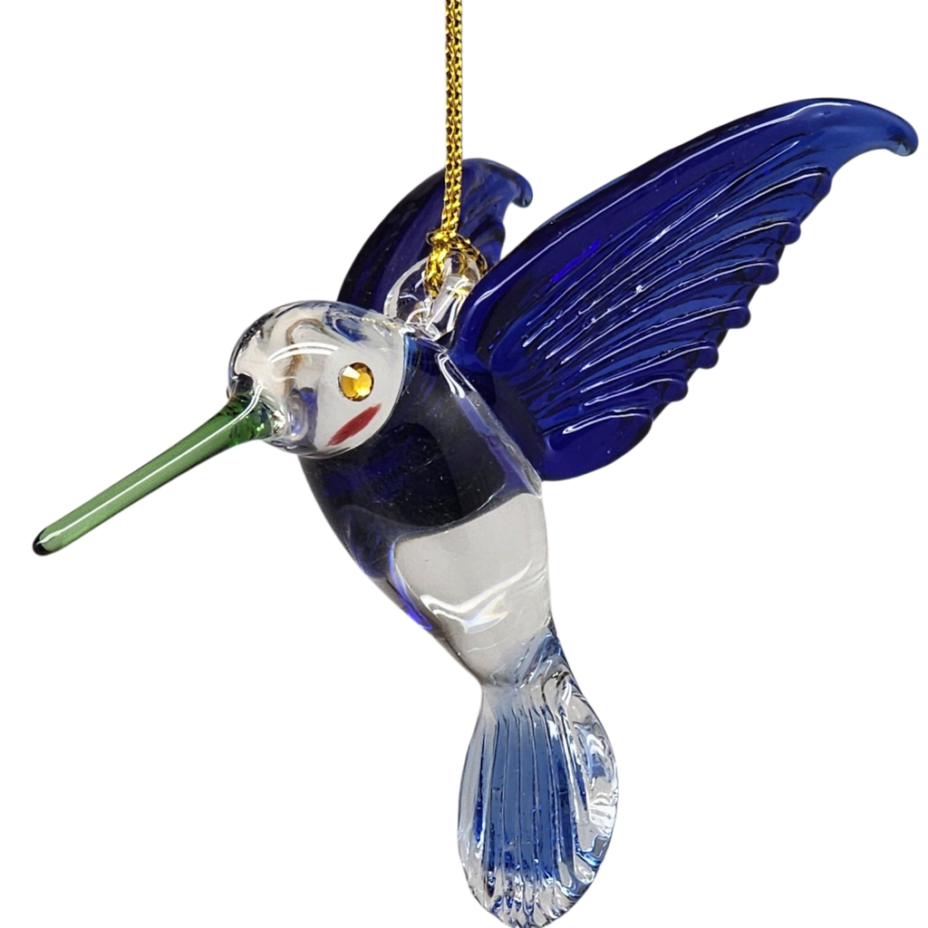 This delightful hummingbird ornament brings a burst of liveliness to any holiday display. Mouthblown from German Pyrex glass in Egypt, its wings and tail feathers are sculpted in a vibrant cerulean blue that fades into crystal-clear glass on the belly and tail, creating the illusion of a bird in mid-hover. A slender green beak and subtle red cheek accent add pops of color, while sparkling crystal eyes catch the light and give this little aviator a twinkle all its own. Each piece is hand-painted and then kiln-baked to ensure the rich hues remain vivid for seasons to come.