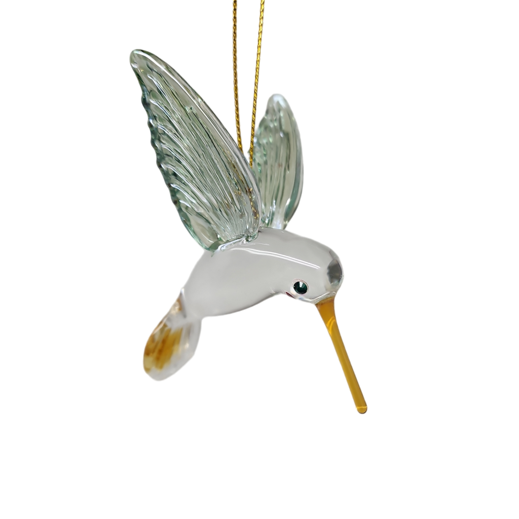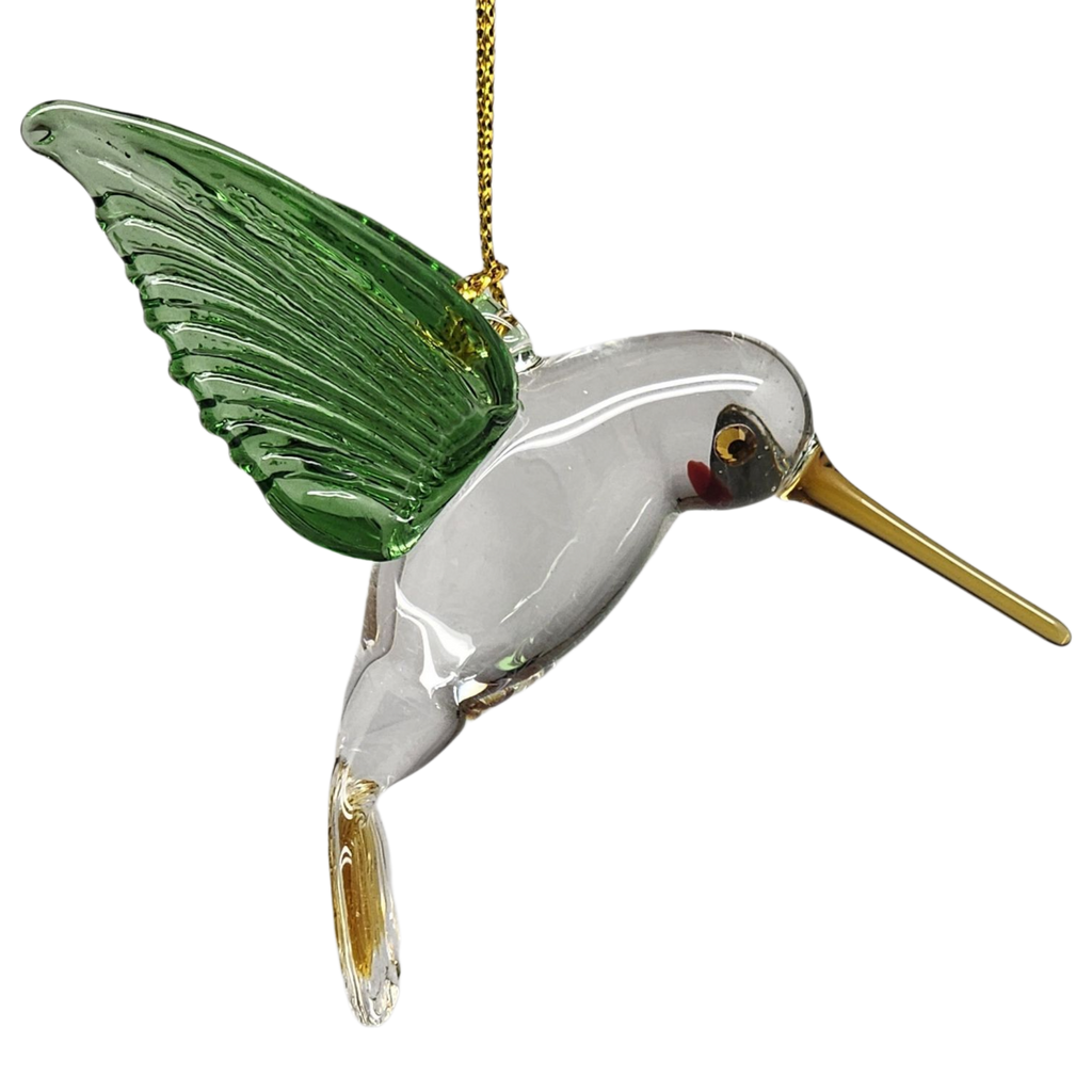 This vibrant hummingbird ornament is a celebration of nature’s tiniest marvels, rendered in lustrous jade-green wings that fade into a crystal-clear belly and tail. Mouthblown from German Pyrex glass by skilled artisans in Egypt, each piece is hand-painted and then baked in a special oven to lock in its shimmering hues. Tiny crystal eyes lend a lifelike sparkle, while a slender green beak and soft red cheek accent complete the delicate portrait of a bird in mid-hover.