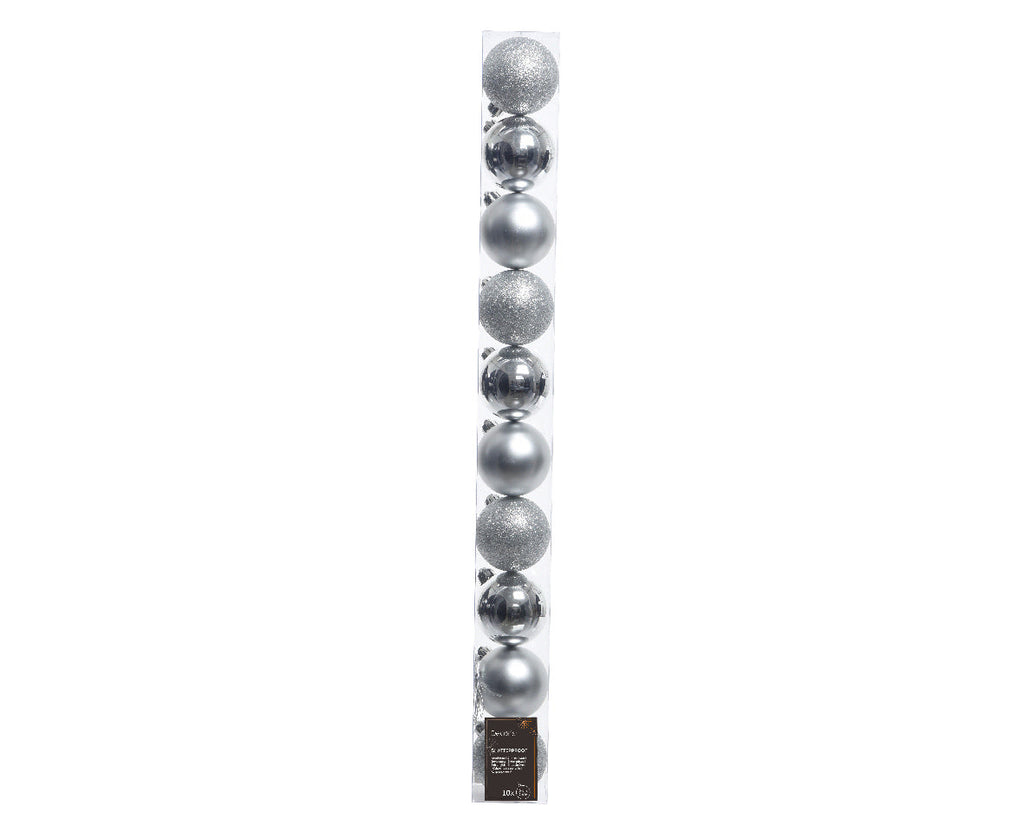 - Set includes 10 assorted ornaments (variety of shiny matte and glitter finishes)