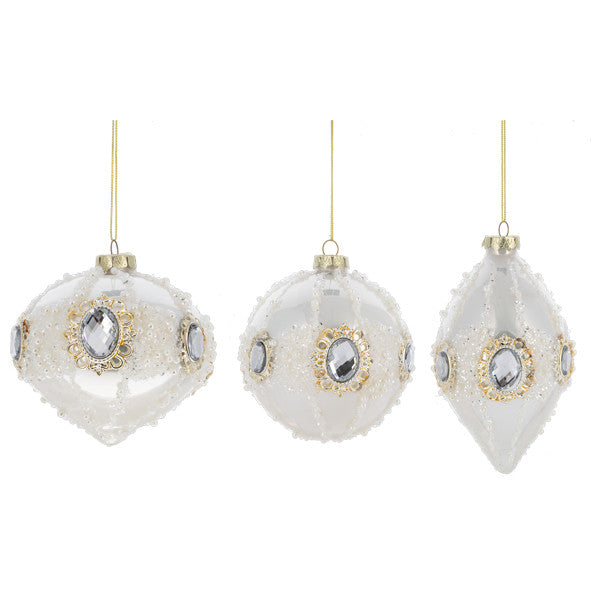 Elevate your holiday decor with this exquisite collection of vintage-inspired glass ornaments, each shimmering with intricate white beaded details and adorned with sparkling jewel accents framed in delicate gold filigree. These timeless beauties add a touch of old-world charm and sophistication to any Christmas tree, embodying the elegance of bygone holiday seasons. Sold separately, this set lets you choose your favorite shapes or mix and match for a stunning display of classic winter glamour.