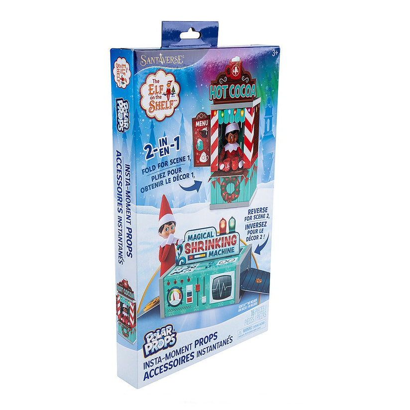 Transform your holiday season with the magical Elf on the Shelf Polar Props Insta-Moment Props set! Designed to enhance your Elf's daily escapades, this 2-in-1 prop scene makes every morning a delightful surprise. Featuring two reversible scenes—the enchanting Hot Cocoa Stand and the fantastical Magical Shrinking Machine—this set offers endless imaginative play and creative possibilities.