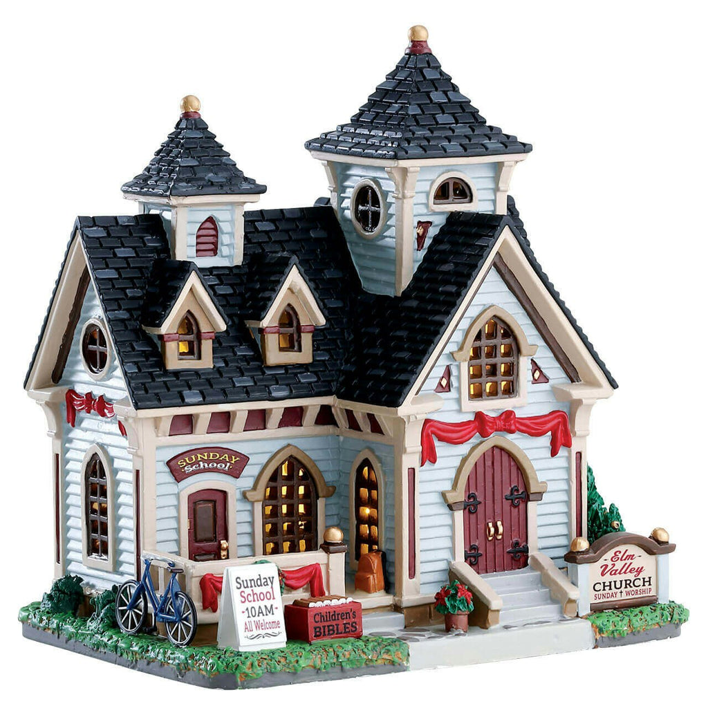 Elm Valley Church is a beautifully crafted lighted village building that evokes the charm and warmth of a small-town church during the holiday season. This inviting structure is adorned with intricate architectural details and festive touches, making it a heartwarming addition to any village display.