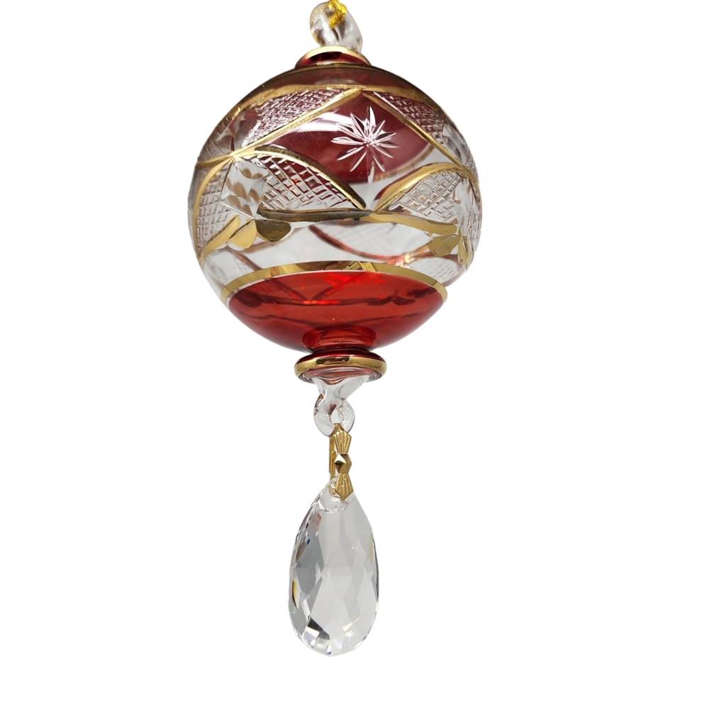 Bring the rich warmth of holiday traditions to your home with this dazzling crimson glass ornament. Handcrafted from mouthblown German Pyrex glass in Egypt, this piece measures just over 6.5 inches tall and features deep ruby red bands that frame a clear glass center lavishly decorated with real 24K gold accents. The intricate gold detailing is baked into the design, ensuring a lasting radiant shine that complements the jewel-toned color perfectly.