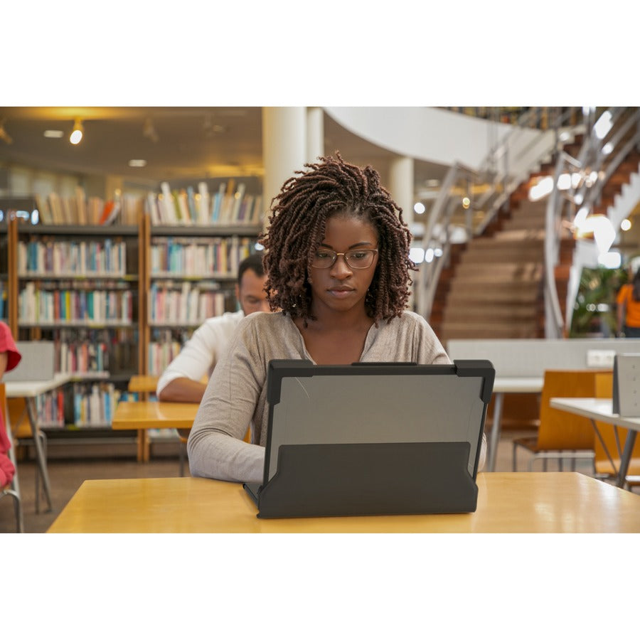 This tough, wrap-around case takes our popular Extreme Shell to new levels of protection and functionality with our new MAXGrip spine. Sporting rugged bumpers and overlap corners, the S model adds protection and functionality with an easy-grip, book-cover spine, designed to also protect the vulnerable hinge area. This wide, textured surface provides more secure carrying, delivering added insurance against drops. The rigid top and bottom panels made of compound polycarbonate, thermoplastic and polyurethane protect against scratches and impact damage. With a snug, perfect fit, the Extreme Shell-S supports all device functions and provides easy port access. Custom colors and MAXProtec antibacterial upgrade available with minimum quantity of 500 (additional fees apply).