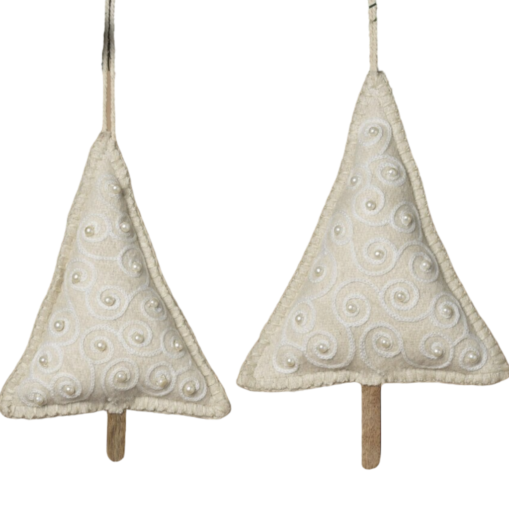 Bring the spirit of the season into your home with our delightful Fabric Tree Ornaments! These charming decorations are beautifully embroidered and adorned with delicate beads, capturing the essence of a winter wonderland in two sizes, approximately 7 and 9 inches tall. Each ornament features a whimsical tree shape, perfect for hanging from your holiday tree, wreaths, or even as a unique addition to your festive table setting. Their soft, muted colors and intricate designs not only add elegance to your decor but also evoke warmth and creativity during this joyous time of year.