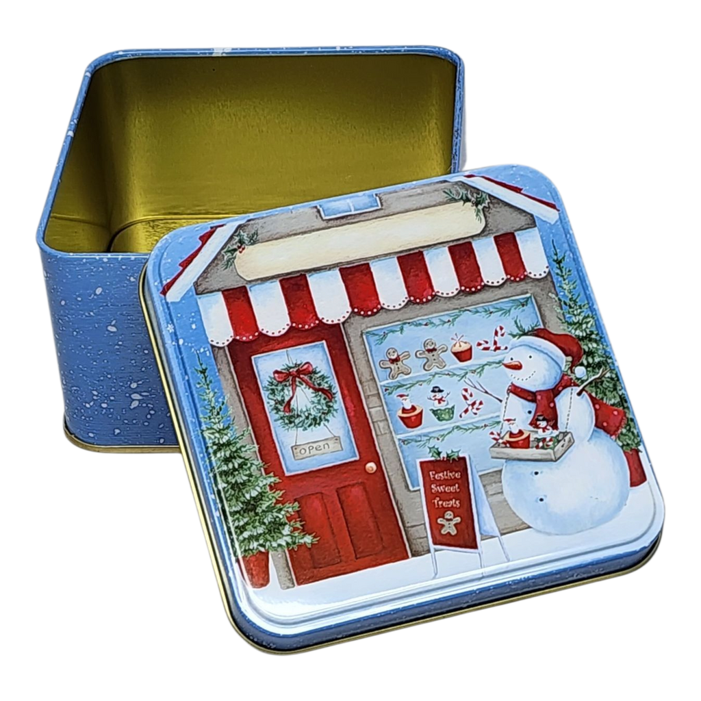 Step into a winter wonderland with the Festive Snowman Treat Tin! This adorable square tin measures just over 4 inches on each side and features a delightful snowy scene with a cheerful snowman donning a cozy scarf, ready to serve up festive sweet treats. The charming storefront design complete with a “Festive Sweet Treats” sign invites visions of holiday cheer, making it the perfect container for cookies, candies, or even small gifts this holiday season.
