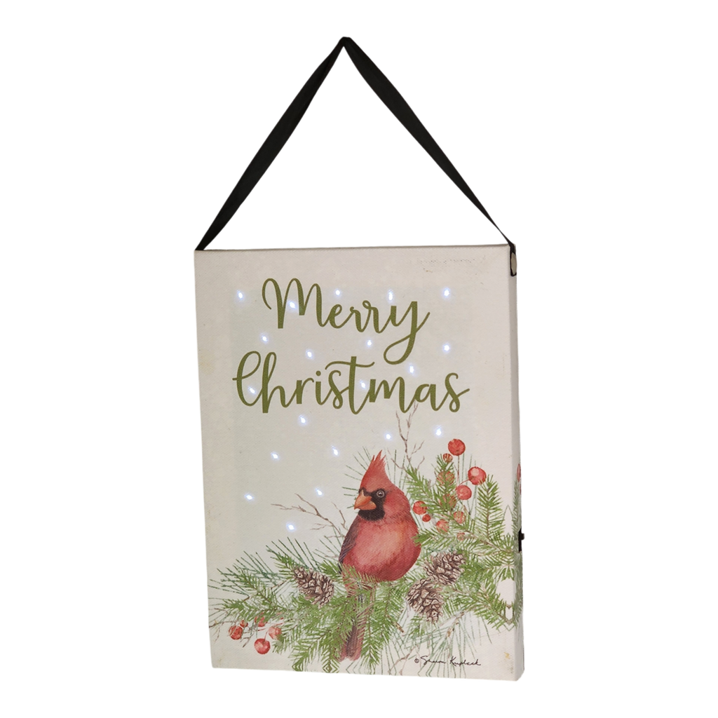 Celebrate the joyous spirit of the season with this exquisite Merry Christmas Fiber Optic Lighted Canvas Art. Measuring 8" x 6", this charming piece captures the beauty of a bright red cardinal perched among lush greenery, pine cones, and holly berries, conveying the cheerful message "Merry Christmas" in elegant script.