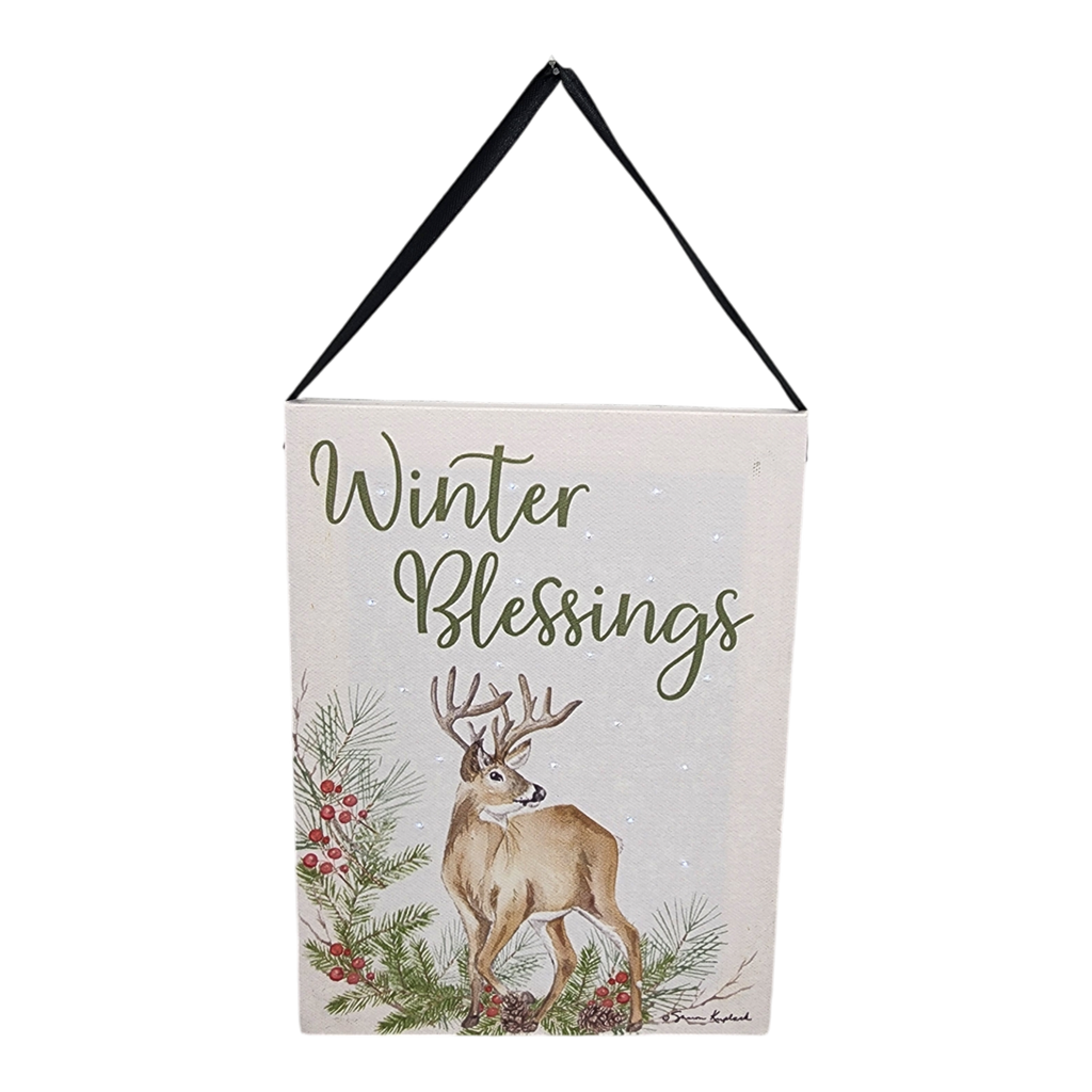 Bring a touch of serene beauty and festive illumination to your home with this enchanting Winter Blessings Fiber Optic Lighted Canvas Art. Measuring 8" x 6", this charming piece showcases a beautifully painted woodland deer amidst snow-covered pine branches and vibrant red berries, accompanied by the warm sentiment "Winter Blessings."