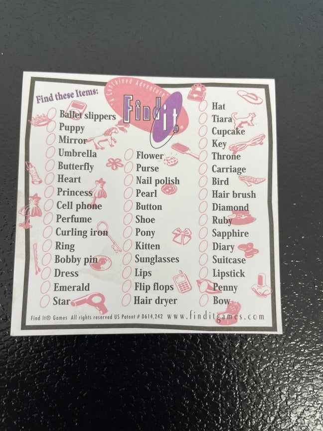 Perfect for running errands, summer travel, waiting rooms, and much more! The Find It® Glitz & Glamour version caters to every age and gender. The perfect entertainment for birthday parties, sleep overs or a day at the spa. The pellets are pink and purple with 40+ hidden objects such as jewels, high heels, ballet slippers, lipstick, a pony, and the elusive US penny. The hidden objects are itemized on the top cap with a check off pad included with the game. All Find It® games are assembled in the USA. (6 Units per case) •
