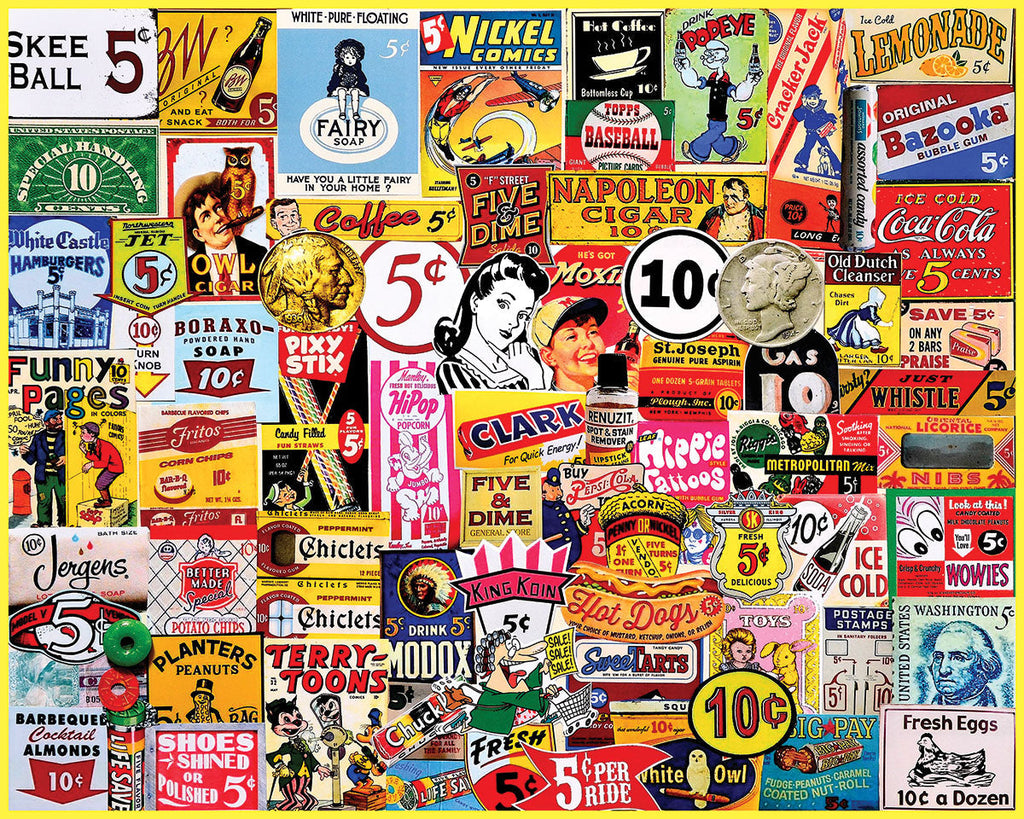 Five & Dime. First opened in 1879, the Five & Dime store was a family favorite known for its low-priced goods. Candies, gum, hot dogs, and burgers. Artist Charlie Girard takes us back to a time when you were happy to have a pocket full of change. 1,000-piece puzzle with a finished size of 24” x 30”.
