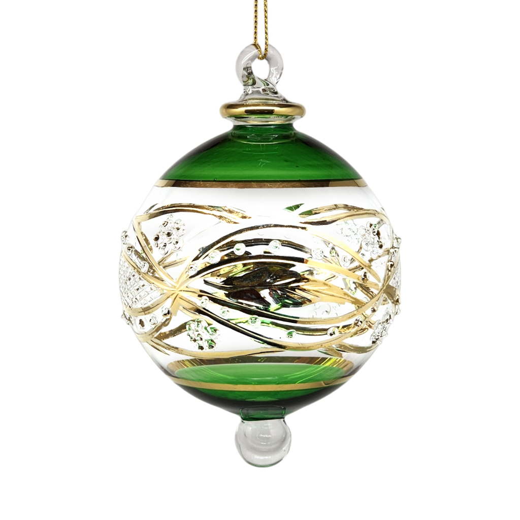 Introduce a touch of refined elegance to your holiday decor with the Floral Etched Glass Ball in Green. This exquisite ornament is masterfully crafted from premium Pyrex, showcasing a mesmerizing blend of green hues and intricate floral etchings. Just shy of 3 inches in diameter, this ornament features 10k genuine gold plating that accentuates its beautiful design, creating a stunning visual impact.