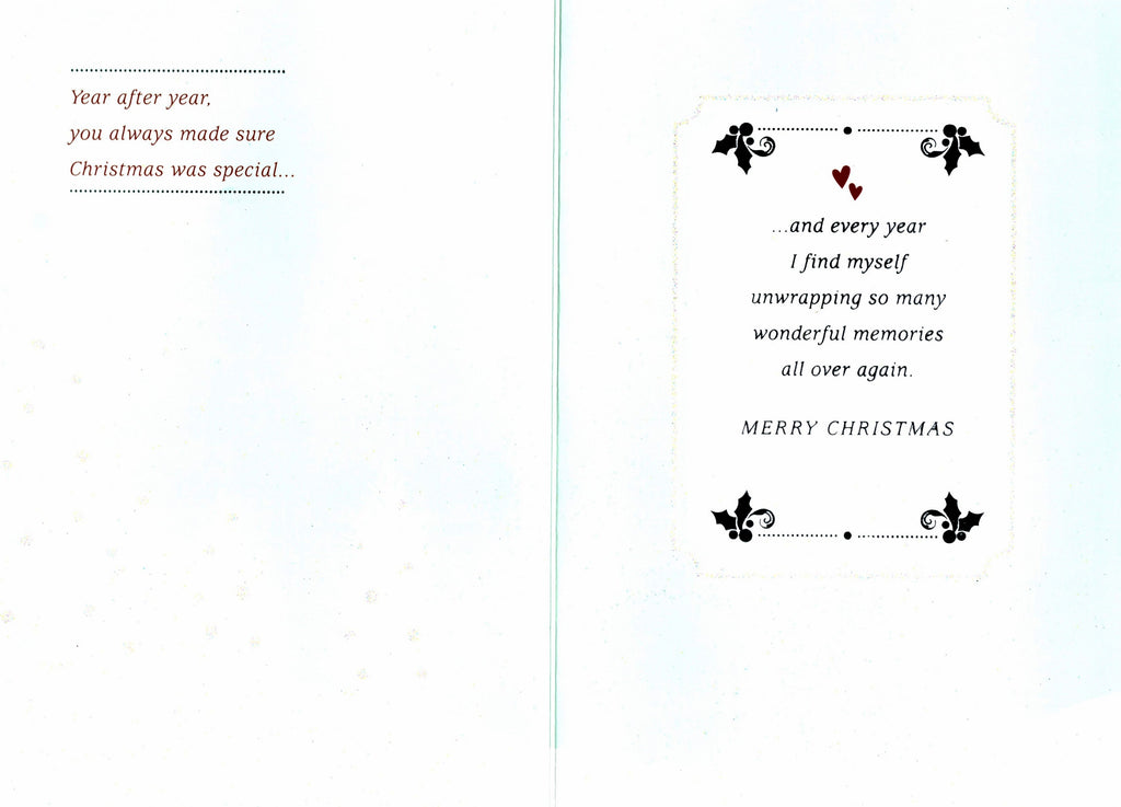 inside: Year after year you always made sure Christmas was special... and every year I find myself unwrapping so many wonderful memories all over again. Merry Christmas
