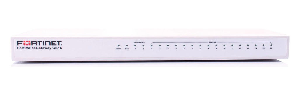 Fortinet FortiVoiceGateway GS16, 2x10/100 ports, 16 x FXS voice gateway. Security algorithms: TLS, SNMP, SRTP. Ethernet LAN data rates: 10,100 Mbit/s, Networking standards: IEEE 802.1Q. Console port: RJ-45. Width: 155 mm, Depth: 345 mm, Height: 35 mm. Product colour: White