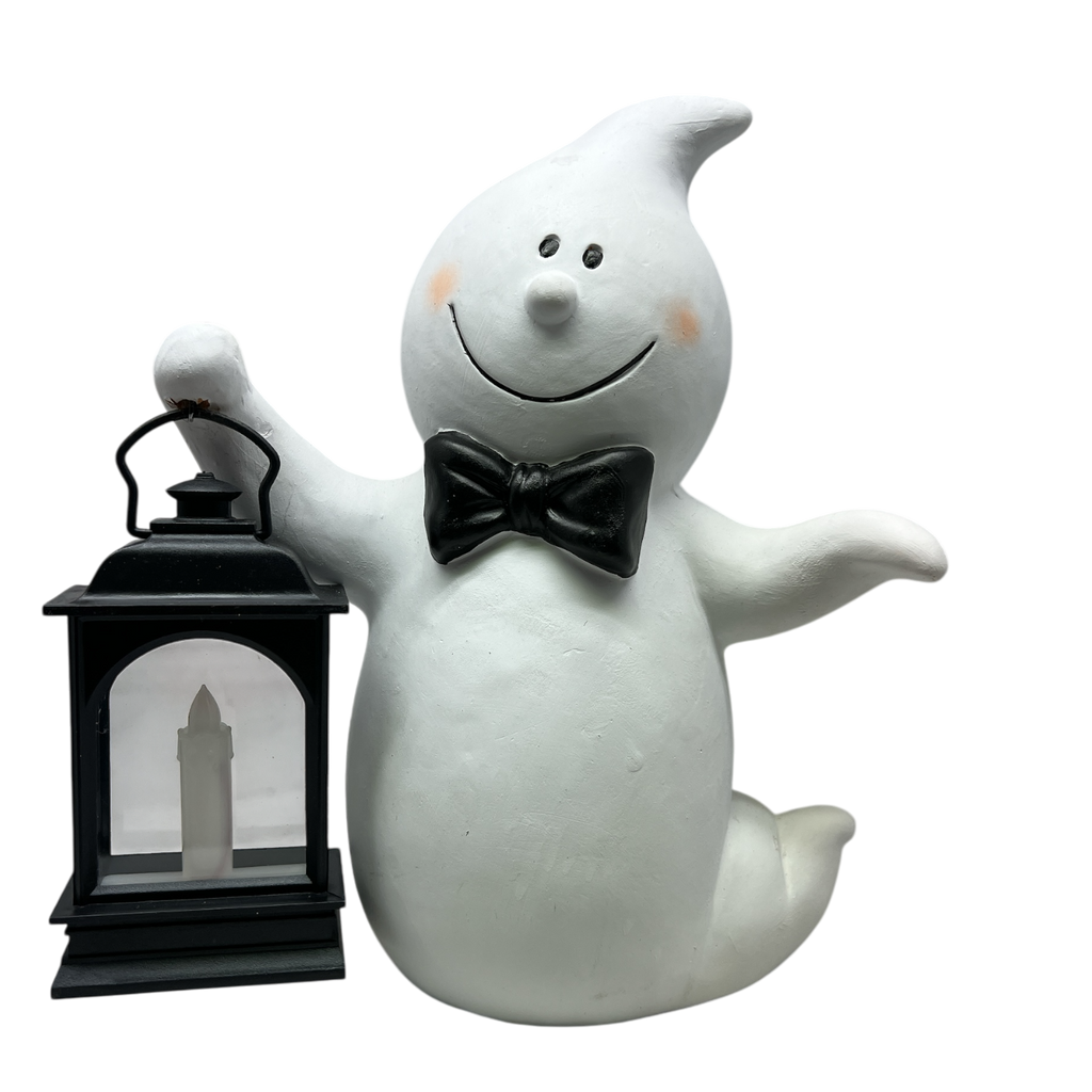 Welcome the magic of Halloween into your home with our delightful Friendly Ghost with Classic Lantern! Standing at 9.5 inches tall and crafted from sturdy terra cotta, this charming ghost figurine brings a playful yet spooky vibe to your seasonal décor. With an adorable black bow tie and a cheerful smile, this friendly ghost is ready to spread joy and brighten your celebrations.