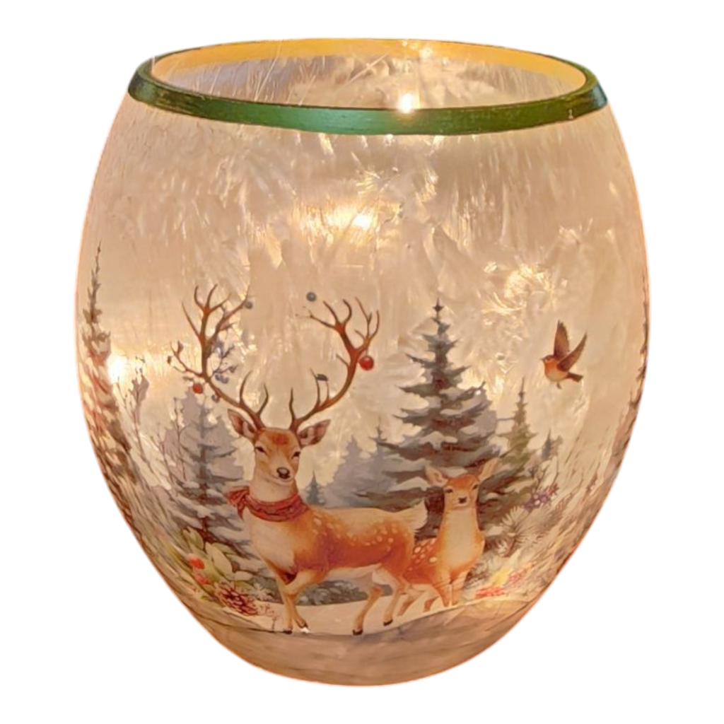 Illuminate your winter evenings with our enchanting Frosted Glass Luminary featuring a whimsical forest deer scene. Standing at around 6 inches tall, this delightful piece creates a warm and inviting atmosphere, perfect for the holiday season. With a string of 10 incandescent bulbs cleverly nestled inside, this luminary casts a gentle glow that highlights the beautifully frosted design, making it an eye-catching addition to your holiday décor.