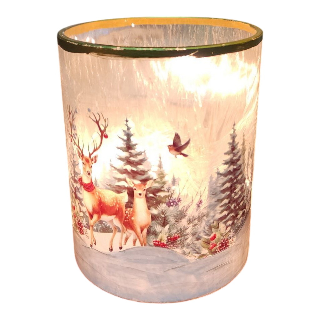 As you cozy up during the cold months, picture the serene beauty of snowy forests while this luminary adds a magical touch to your home. Perfect for holiday gatherings or as a comforting nightlight, it sets the scene for cherished memories with family and friends under twinkling lights. Guests will be captivated by the graceful deer and frosty trees, evoking a sense of peace and tranquility reminiscent of a winter wonderland. Light up your holidays and heart with this charming luminary that will surely become a beloved seasonal staple for years to come!