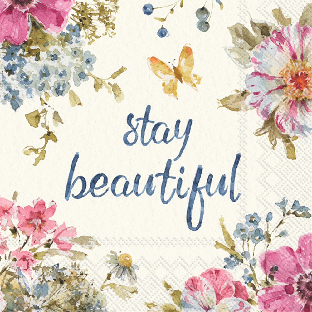 Brighten up your gatherings with our lovely Garden Flower Cream Cocktail Napkins! This charming package includes 20 three-ply napkins, each measuring 5 inches by 5 inches, featuring a beautiful floral design accented with vibrant blooms and a sweet message that reads "stay beautiful." Perfect for adding a touch of elegance to any occasion, these napkins are ideal for cocktail parties, brunches, or cozy get-togethers with friends and family.