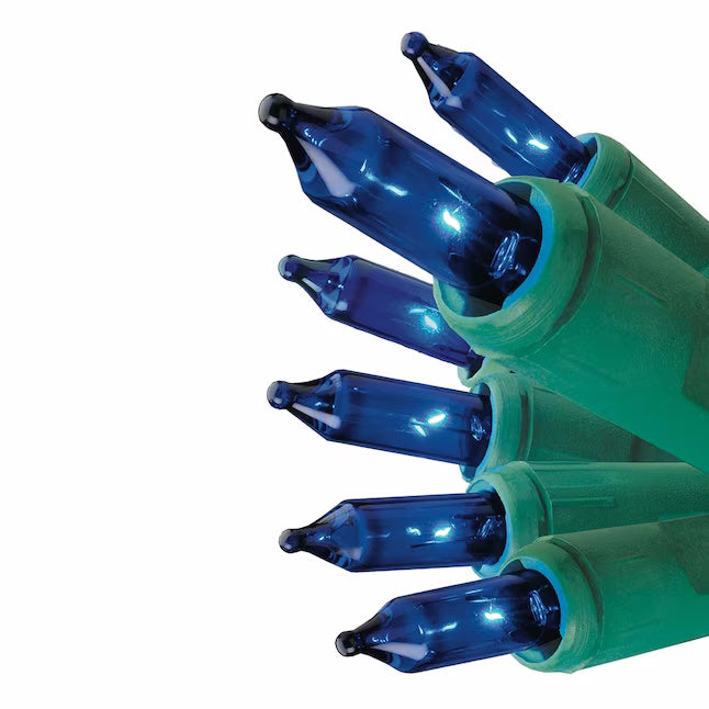 GE String-A-Long incandescent 5mm miniature 100-count blue light set. 3-Inch lead wire, 2.5-inch lamp spacing, 3-inch end connector, 20.6-feet lighted length, and green cord with fused plug.