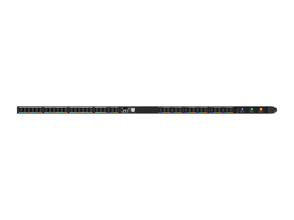 The Vertiv Geist VP4UU0A1 is a vertical rack power distribution unit with a universal input that supports common AC power configurations. It has (30) Combination C13/C19 outlets providing 11kW of power capacity. This unit can accommodate input power ranging from 16A-48A and 208V-415V in both single-phase and three-phase configurations. It helps simplify the rPDU procurement process since users can use a single model to work with different power sources. It is integrated with the Vertiv Geist Next Generation Interchangeable Monitoring Device (IMD). It has a 128x128 high-contrast LCD that displays the power usage. It features enhanced security with a secure boot that helps protect data and operations. It also has a redundant power-sharing port that connects two IMDs in the rack and provides backup power in case of power loss. The units are Dual Listed (UL/CE), TAA-Compliant, and individually tested for functionality and reliability.