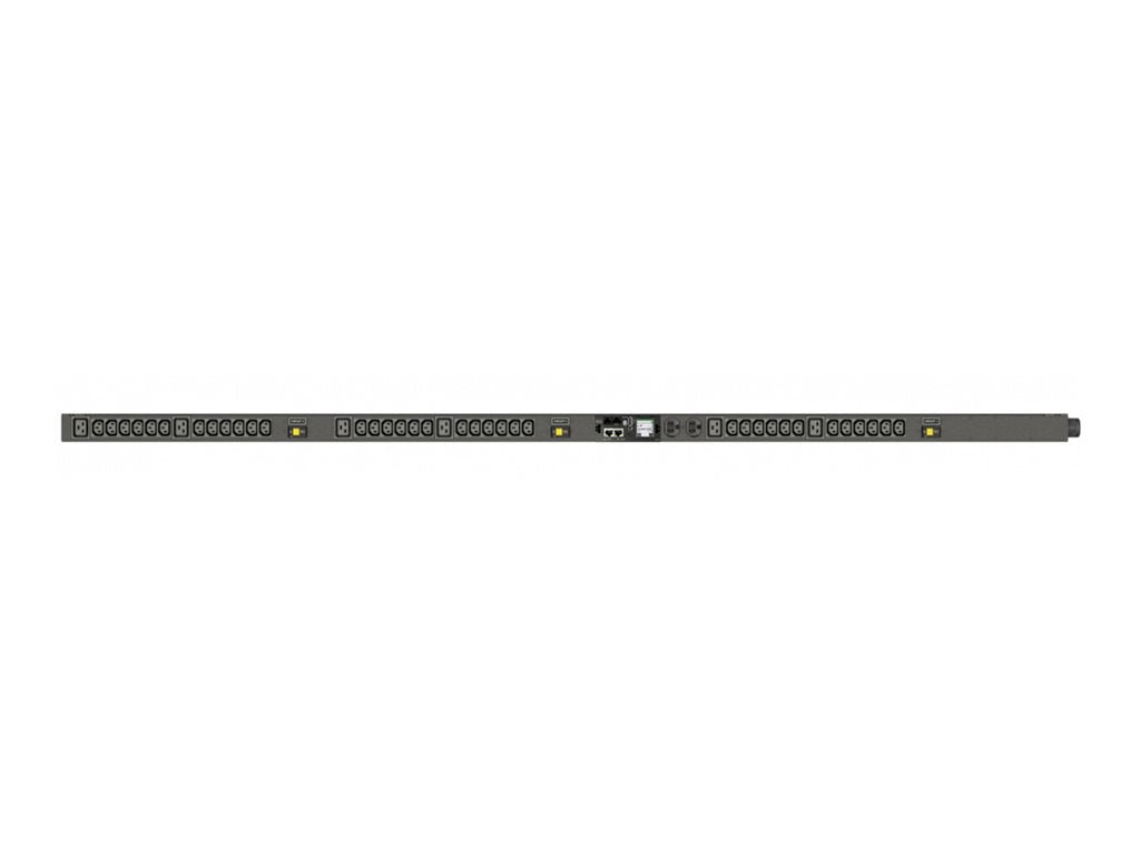 The Vertiv Geist Monitored Rack PDU VP4N30AR is a 30A, 120V/208V WYE, 0U, vertical rack power distribution unit with input power monitoring. It has (36) IEC C13, (6) IEC C19, and (2) NEMA 5-20R receptacles and NEMA L21-30P plug providing 8.6kW of power capacity. This device offers quick access to critical power usage information down to the device level to evaluate energy usage trends and maximize uptime. It is integrated with the Vertiv Geist Next-Generation IMD which displays power data via its 128x128 high-visibility LCD. It has an internal sensor that intelligently adjusts the orientation based on horizontal or vertical installation. This includes a redundant power-sharing port that connects two IMDs in the rack and provides backup power in case of power loss. Enhanced security with a secure boot is added to the device to help ensure data and operations are protected. The units are UL-listed, TAA-compliant, RoHS certified, and individually tested for functionality and reliability.
