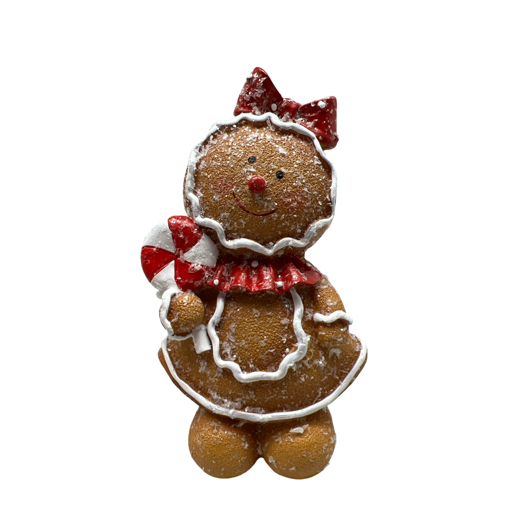 The Gingerbread Cookie Girl Figurine, a charming sweet treat for your holiday décor that embodies all the joy and warmth of the season! Standing at approximately 5.75 inches tall and about 3.5 inches wide, this delightful figurine features a joyful gingerbread girl adorned with a bright red bow and a cheerful ruffled collar. With her cute smile and festive candy cane in hand, she’s ready to spread holiday cheer throughout your home!