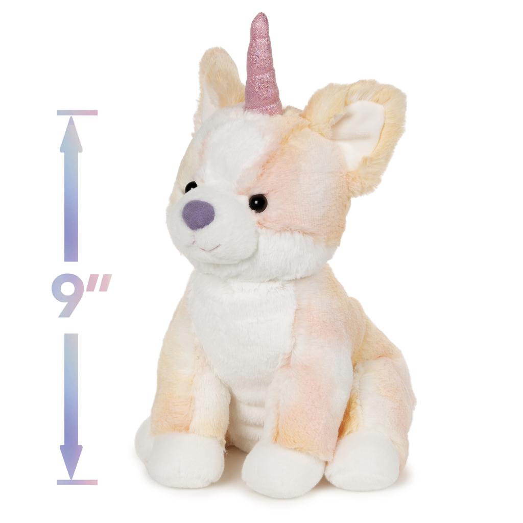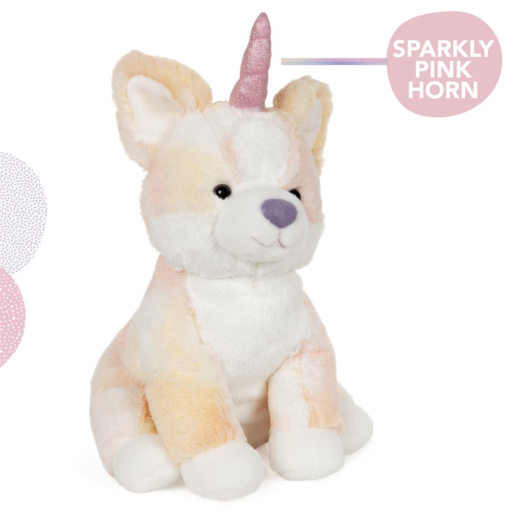 - PLUSH CORGI PUPPY + UNICORN: This unique, whimsical corgicorn plush features pastel orange sherbet-colored fur accented by swirls of orange, pink, and white and topped by a sparkling iridescent pink horn.