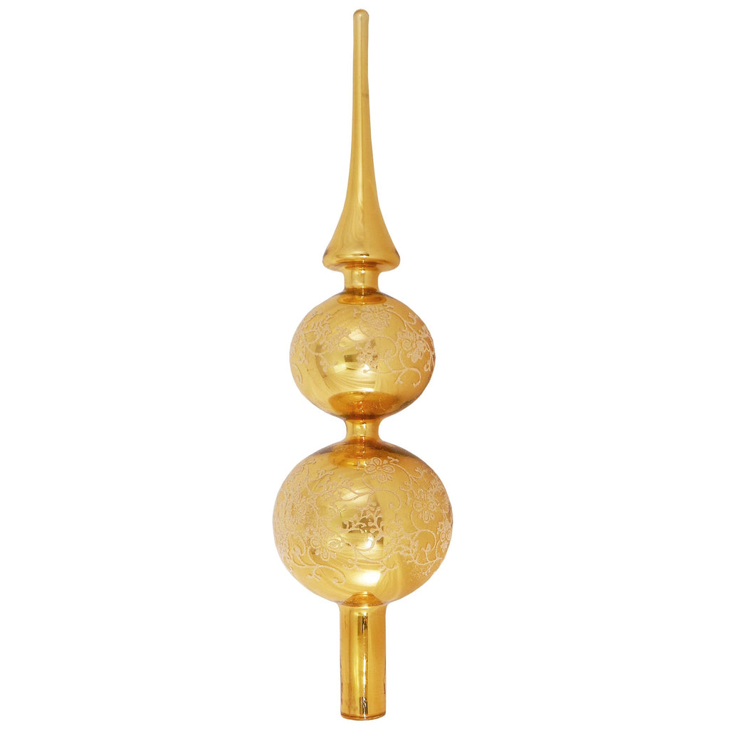 Bring everlasting shine to your holiday decor with this tree topper. This matte shiny topaz tree topper with glitter lace is the ultimate showpiece that elevates the glamour of your overall decorations. Spread the delight of holiday decor with these kinds of exquisite adornments. Product Features: Gold floral glitter lace matte finial tree topper Unlit Glass ornaments are crafted from molten glass (not a mold) for a stylish seamless design Manufactured by highly skilled artisans and craftspeople Glass ornaments are silvered on the inside giving them the absolute best color definition possible Recommended for indoor decorative use only Made in the USA Dimensions: 13" high x 6" diameter Material(s): glass