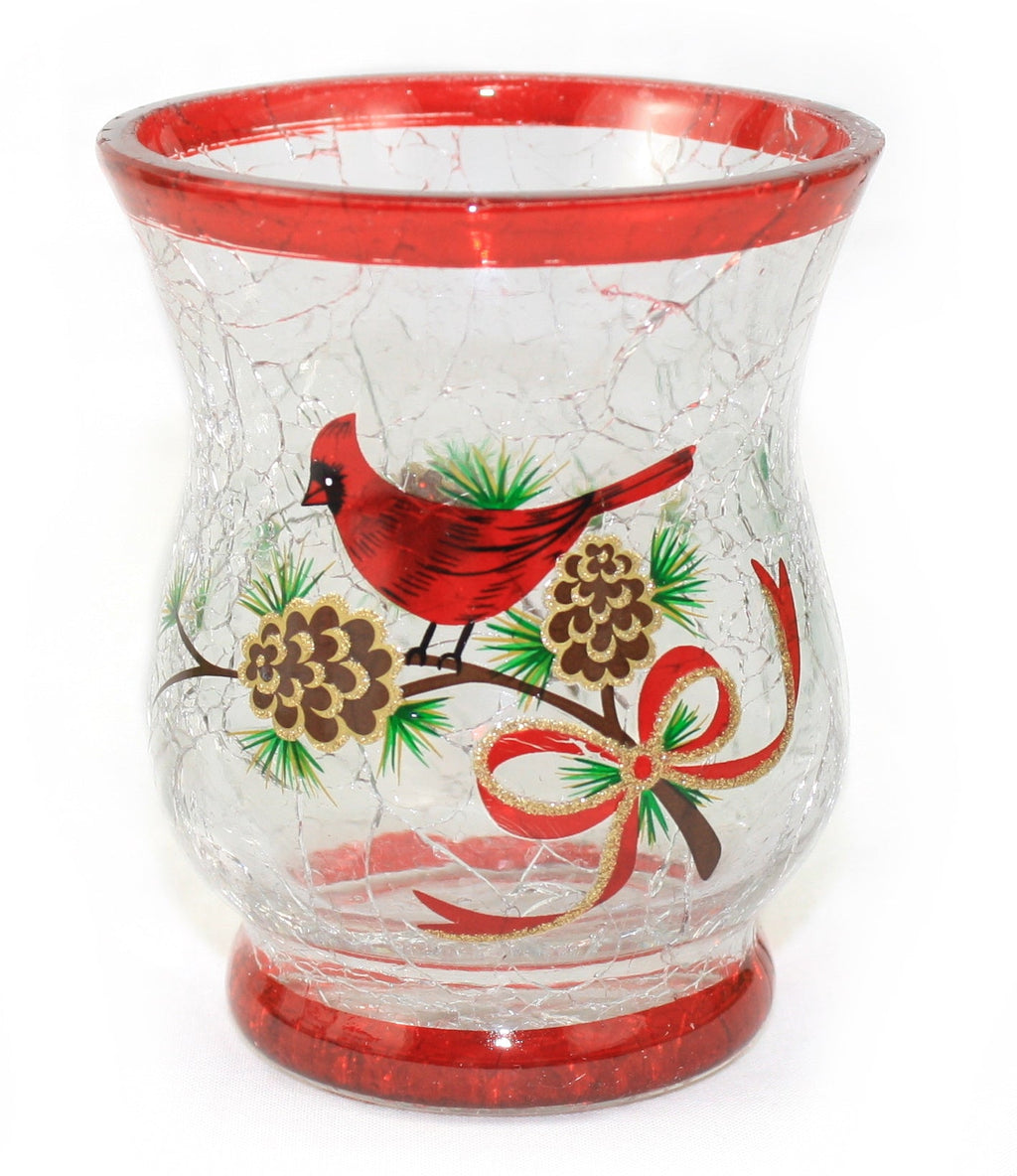 Classic crackle glass candle holder is perfect to add ambiance to a mantle, table top, or as part of a centerpiece.