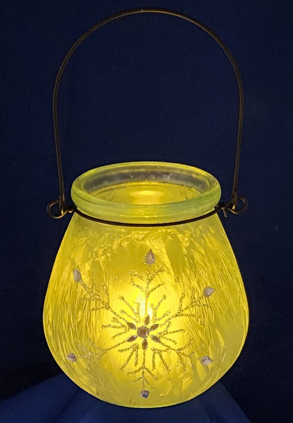 A pair of glass luminary lanterns accented with a glitter and gem snowflake design. Each luminary comes with a battery-operated votive flame candle to light the luminary from within.