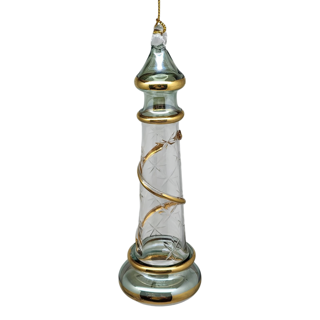 Set the stage for a cozy holiday ambiance with the delightful Classic Lighthouse Ornament. Standing just over 6 inches tall and about 2 inches in diameter, this beautiful piece is handcrafted from mouth-blown glass, showcasing a timeless spiral design that exudes charm. Adorned with shimmering 24K gold, this ornament is both elegant and serves as a heartfelt keepsake, perfect for cherishing memories for years to come.